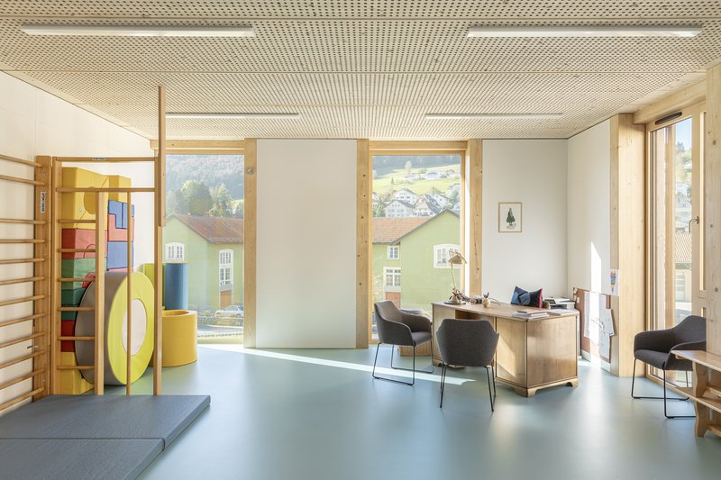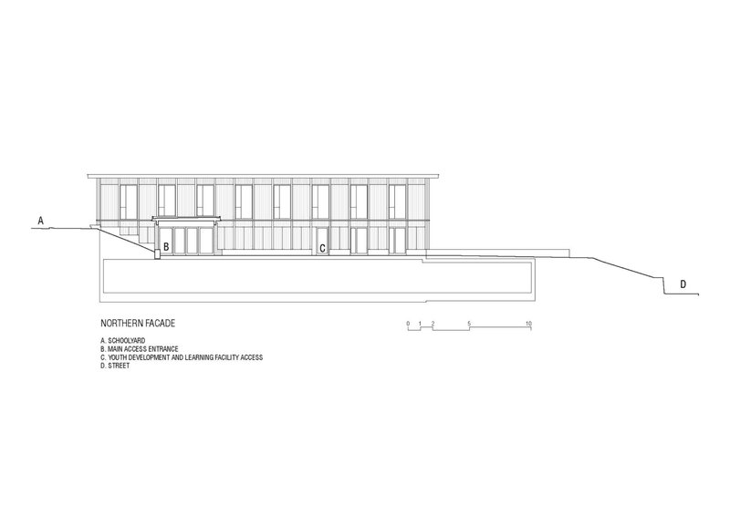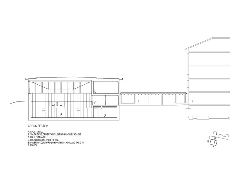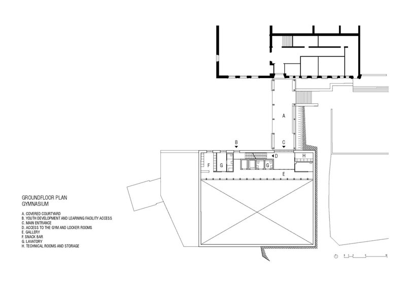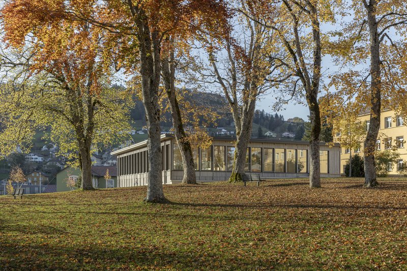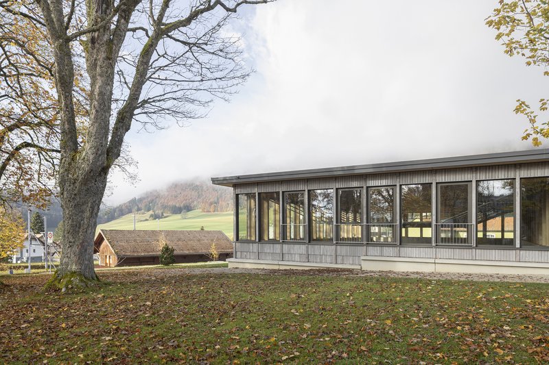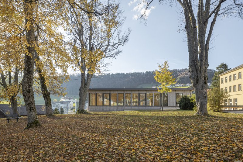 The gymnasium's design reflects a deep commitment to the preservation of the natural environment. Nestled between a school building and an adjacent garden that offers stunning views of the surrounding mountains, the structure makes efficient use of the constrained site. By maintaining a low profile and utilizing the natural slope of the terrain, the building minimizes its visual impact while enhancing the overall experience of the area. The use of local wood and natural materials further strengthens the connection to its natural context, ensuring that the gymnasium complements rather than competes with the existing landscape.