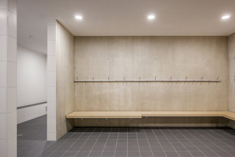 The gymnasium benefits from a carefully considered orientation that maximizes natural light and panoramic views. The sports hall, located on the south side, enjoys a triple orientation, allowing ample sunlight to flood the space while offering breathtaking views of the surrounding mountains. On the north side, a 6-meter-thick volume houses additional premises, including locker rooms and storage areas, as well as the youth development facility on the upper floor. These areas benefit from natural daylight through the south-facing windows and offer a direct connection to the breathtaking landscape.