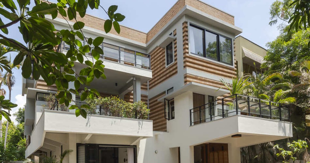 The house opens outward to the garden on its eastern side, where cantilevered balconies and terraces invite natural light and create a seamless connection with the outdoors. Double and triple-height spaces, combined with fluted glass windows and salvaged pergolas, shield the interiors from neighboring buildings while maintaining privacy and natural ventilation.