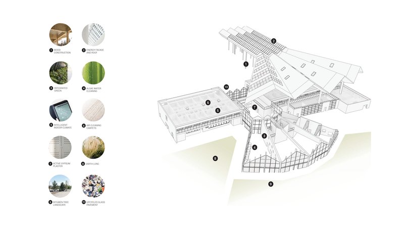 The project emphasizes local sourcing and the use of active materials that purify the air. Interior elements like carpets, plasterboard, and roofing materials contribute to cleaner indoor air, while the extensive use of windows and skylights ensures natural light permeates the building, reducing the need for artificial lighting.