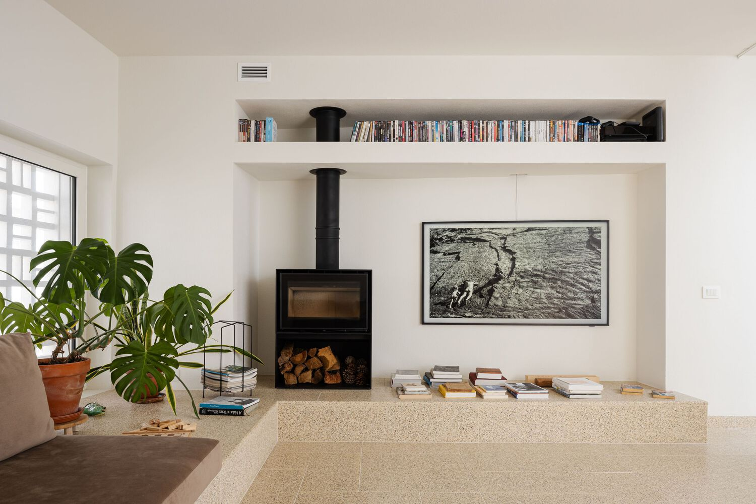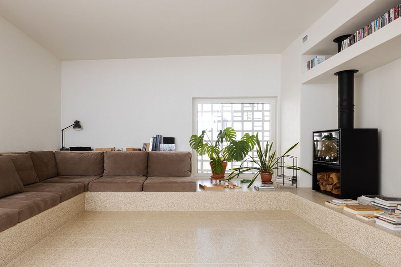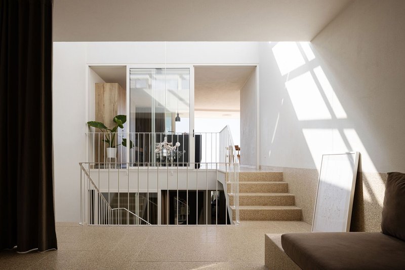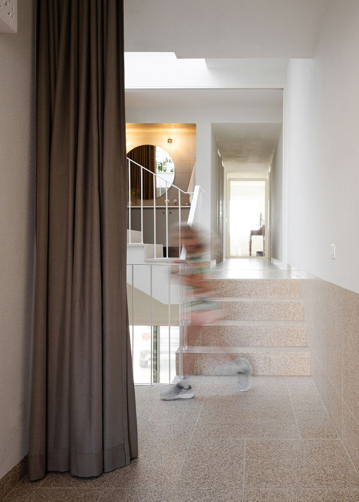 The design of Casa M ensures that space flows fluidly between different areas of the house. The use of a single terrazzo floor that extends uninterrupted from the parking area to the terrace enhances this spatial continuity, allowing the different areas of the home to feel connected. The smooth and textured surfaces of the floor, combined with the strategic use of fabric curtains, create a comfortable, open-plan environment that encourages interaction between family members and guests.