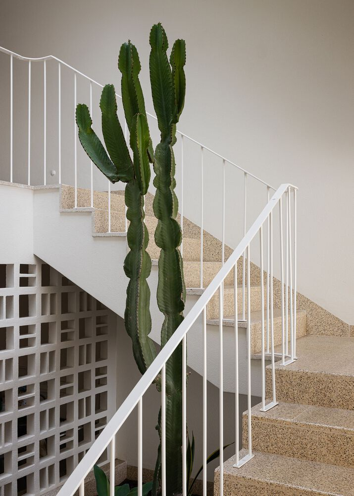 The facade of Casa M is a striking example of how contemporary architecture can respect and reinterpret traditional building methods. The quiet white exterior is brought to life through variations in surface texture, such as smooth renderings and perforated gates, along with the use of breeze blocks that create a dynamic interplay of light and shadow. The facade not only contributes to the building’s aesthetic appeal but also serves practical purposes by providing shade, ventilation, and privacy. This thoughtful design creates a space that is not only visually appealing but also environmentally responsible.