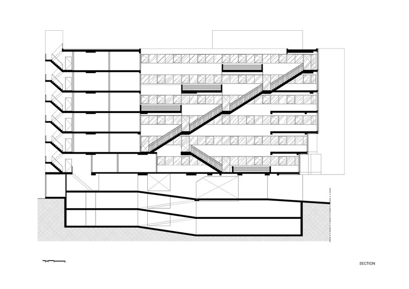 The building's design incorporates elevated greenery and communal spaces that promote well-being and social interaction. The ground floor acts as a public space within the compact urban environment, highlighted by an exterior staircase adorned with greenery.