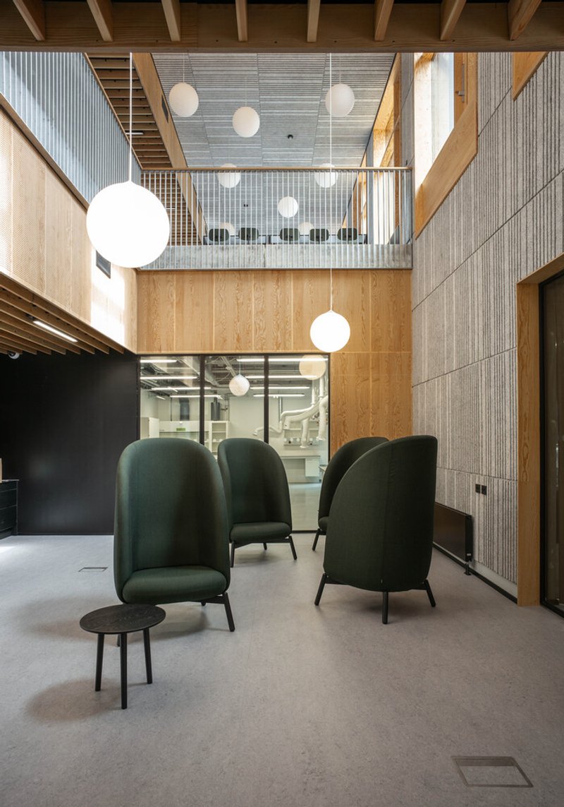 Within its walls, the DTU B112 Research Hub is designed to promote collaboration across disciplines. Glass walls between laboratories enable visibility and interaction, creating a cohesive community of researchers and students. This design choice ensures that the hub is not just a place of work but a thriving center for innovation and knowledge sharing.