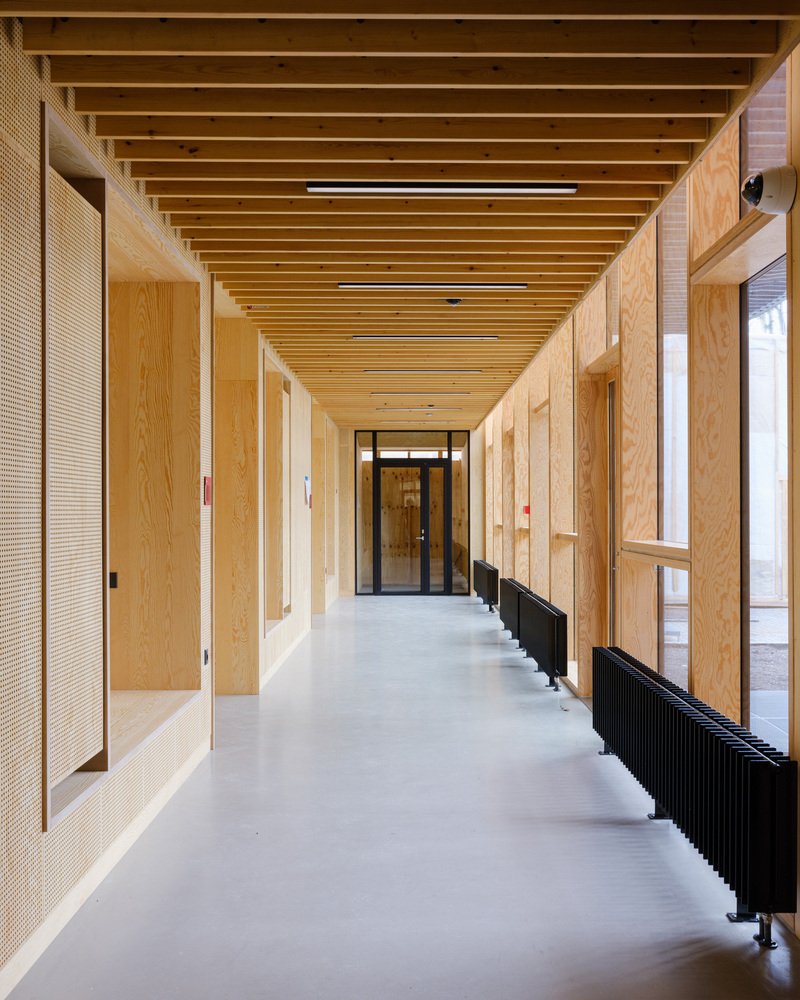 The architectural strategy behind the DTU B112 Research Hub emphasizes flexibility and sustainability, particularly regarding material consumption. A column/beam structural system underpins this approach, allowing the space to adapt to evolving research needs while maintaining its commitment to environmental principles.