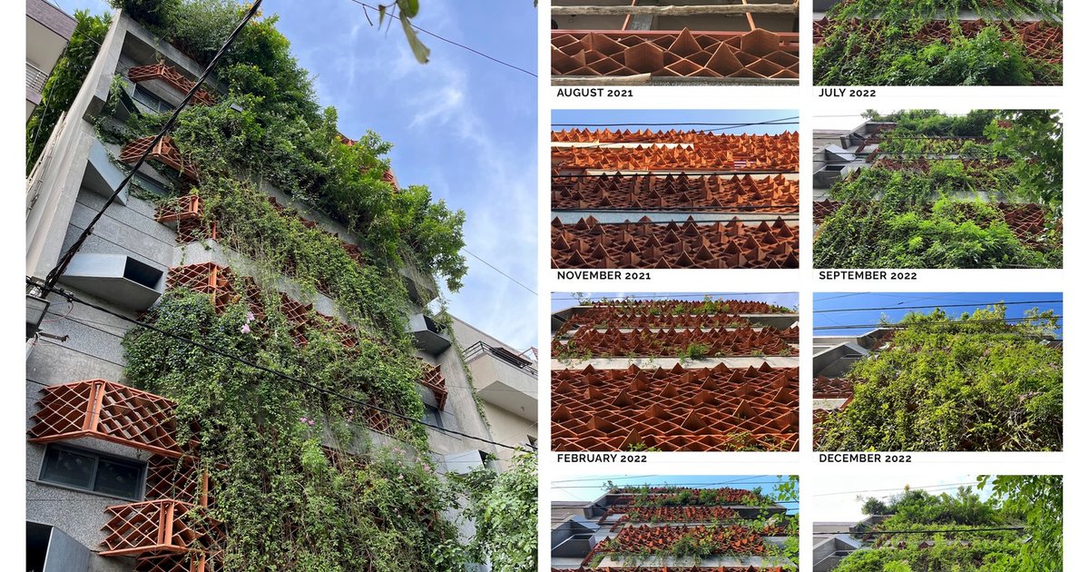 The façade is inspired by traditional water jugs that use evaporative cooling to maintain a lower temperature. This principle is ingeniously applied here through a drip irrigation system that sprinkles water on the terracotta tiles, enhancing cooling efficiency.