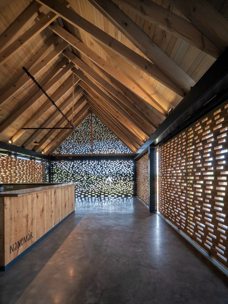 The choice of materials in the construction of the Barn Small Bistro speaks volumes about the project's commitment to sustainability. Oak, known for its durability and strength, forms the backbone of the large sliding walls that open up to nature, inviting the landscape into the dining space. Basalt, a volcanic rock, and slate are used in the walls and roof, respectively, drawing a direct connection to the natural world and ensuring that the building ages gracefully, adapting to the changing conditions around it.
