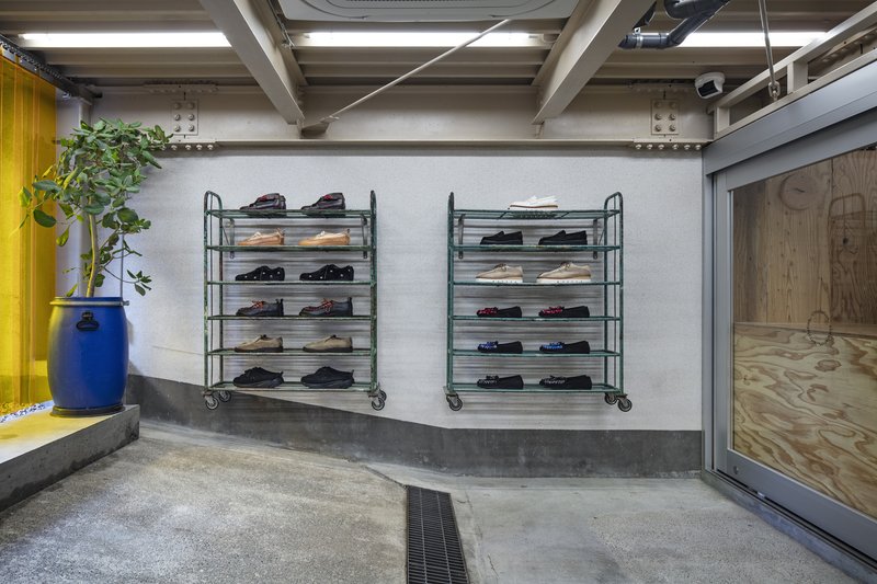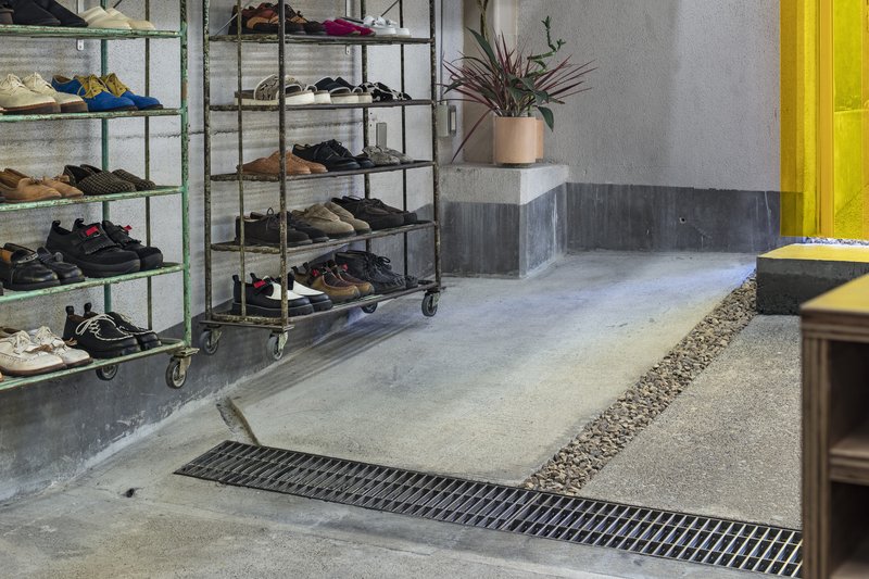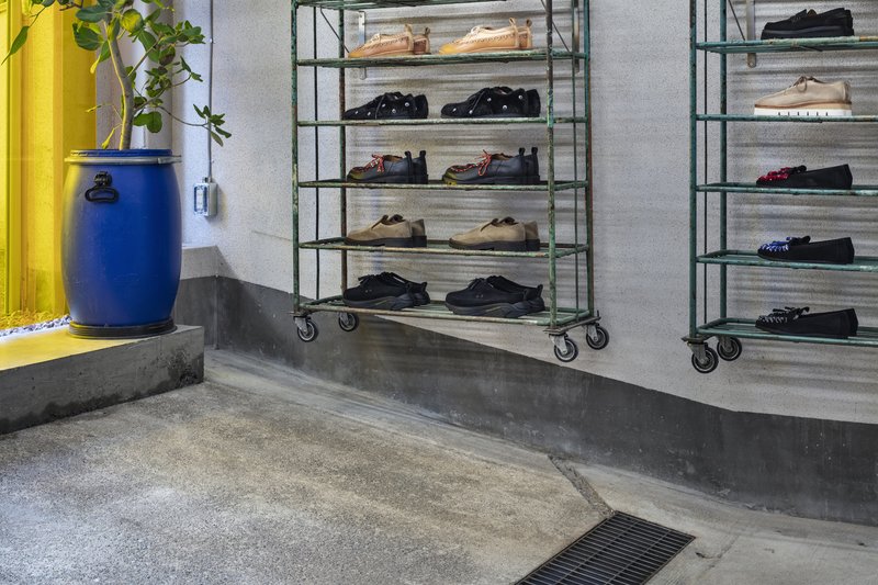 One of the most striking features of the retail space is its sloped floor, a challenging element that dictated innovative design solutions. Standard furniture placement was impractical, so DDAA adapted by repurposing old shoe racks with casters from the client’s collection, mounting them on the walls. This approach not only resolved functional issues but also added a layer of visual intrigue, emphasizing the workshop's commitment to reuse and repurposing.