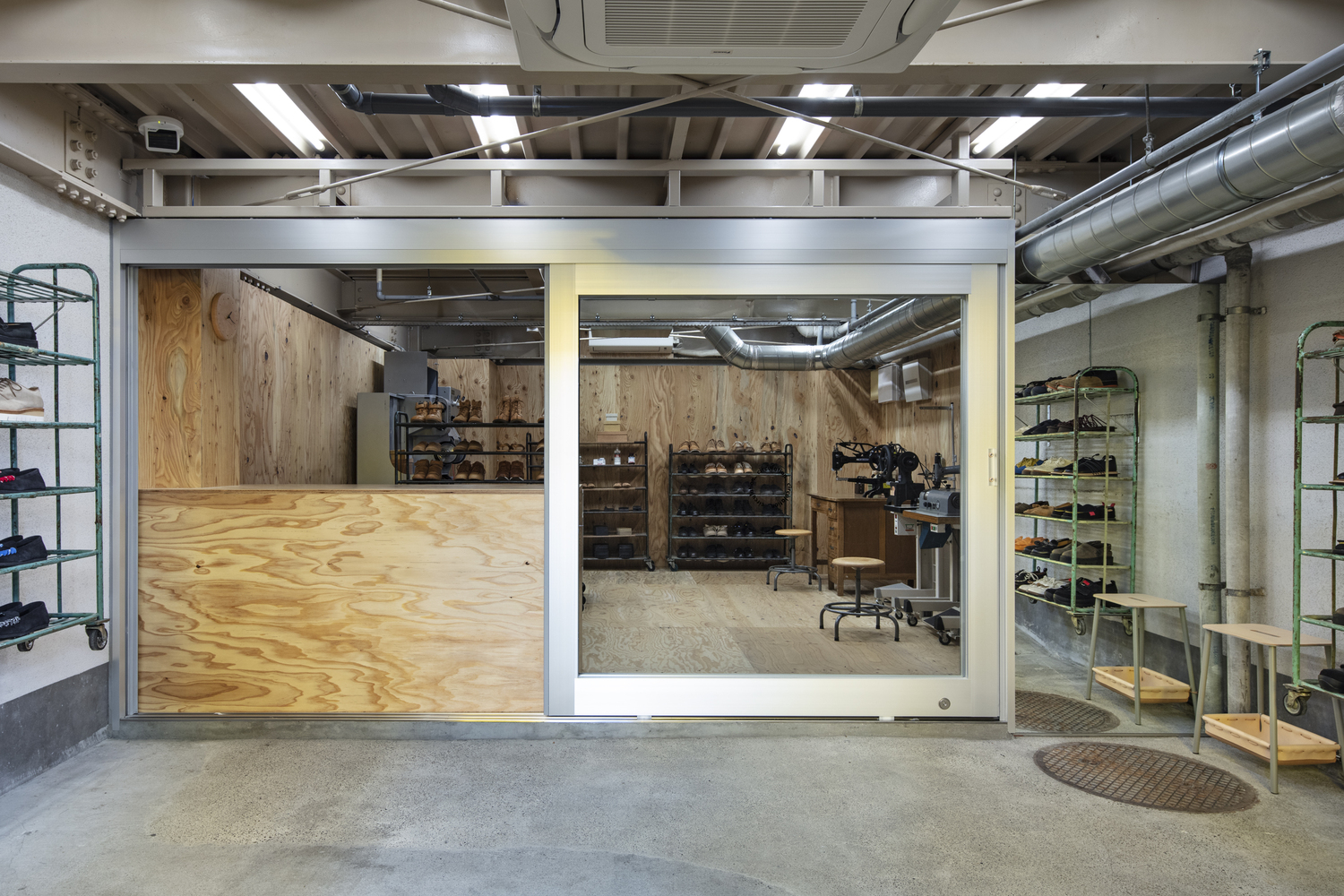 The spatial layout of Circulation is thoughtfully divided into two zones. The front area serves as a retail space for showcasing and selling products, while the rear section houses the repair workshop. An extra-large, aluminum-frame sliding door acts as a dynamic partition between the two zones, opening to reveal a functional counter. This seamless integration ensures a cohesive experience for customers and staff.