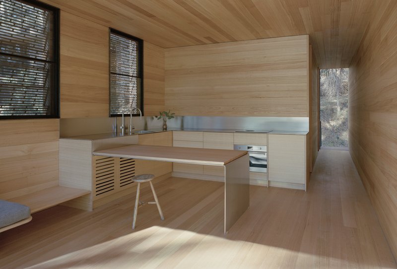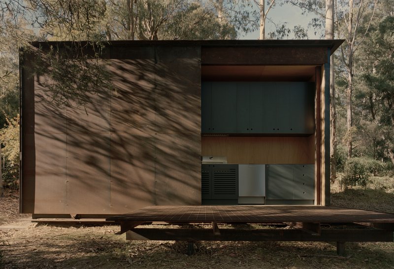 The interiors of the Sawmill Treehouse feature sustainably sourced timber, adding warmth and texture to the space. The contrast between the steel exterior and the timber interior reflects a thoughtful balance—fire resilience on the outside, natural comfort within.