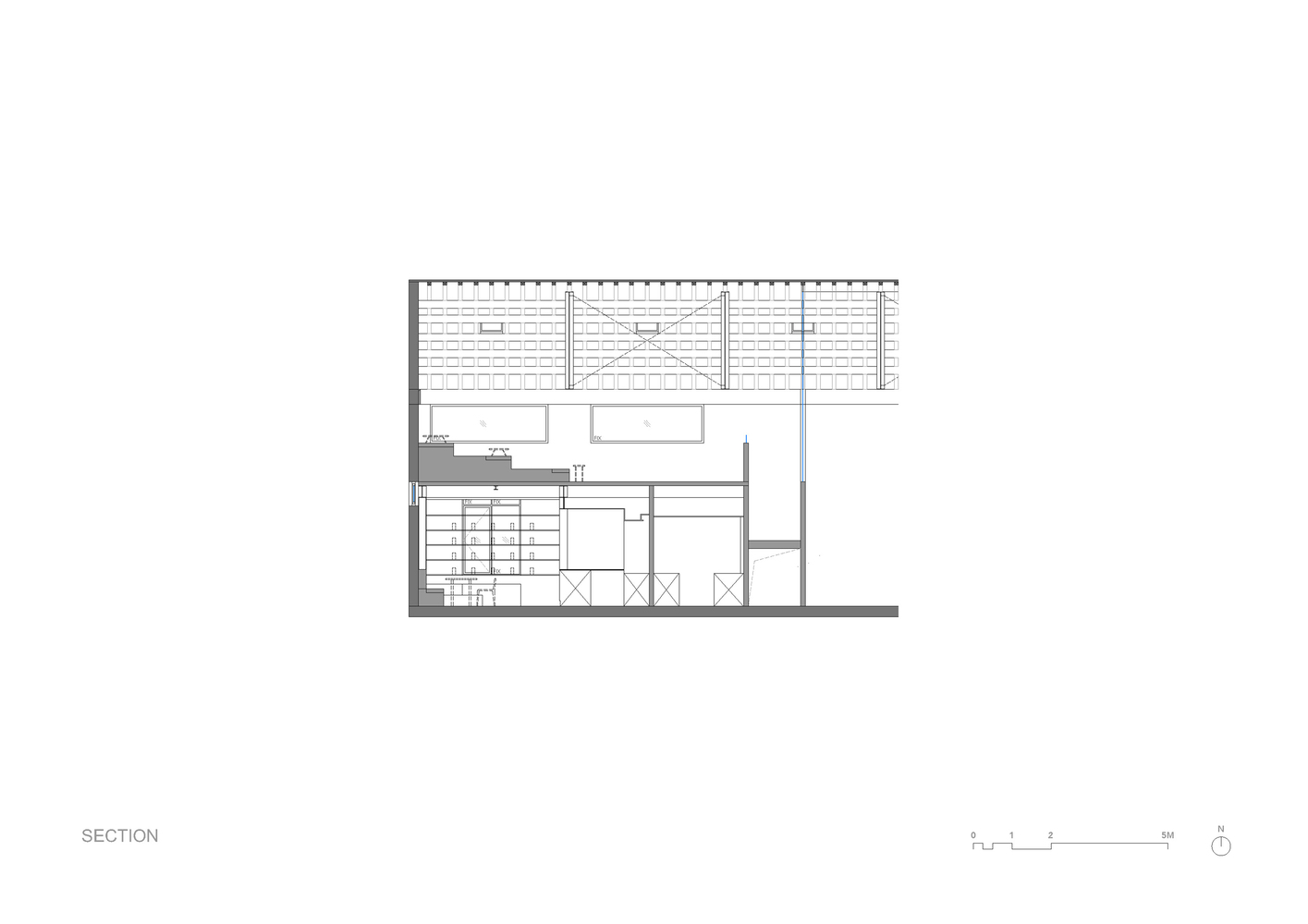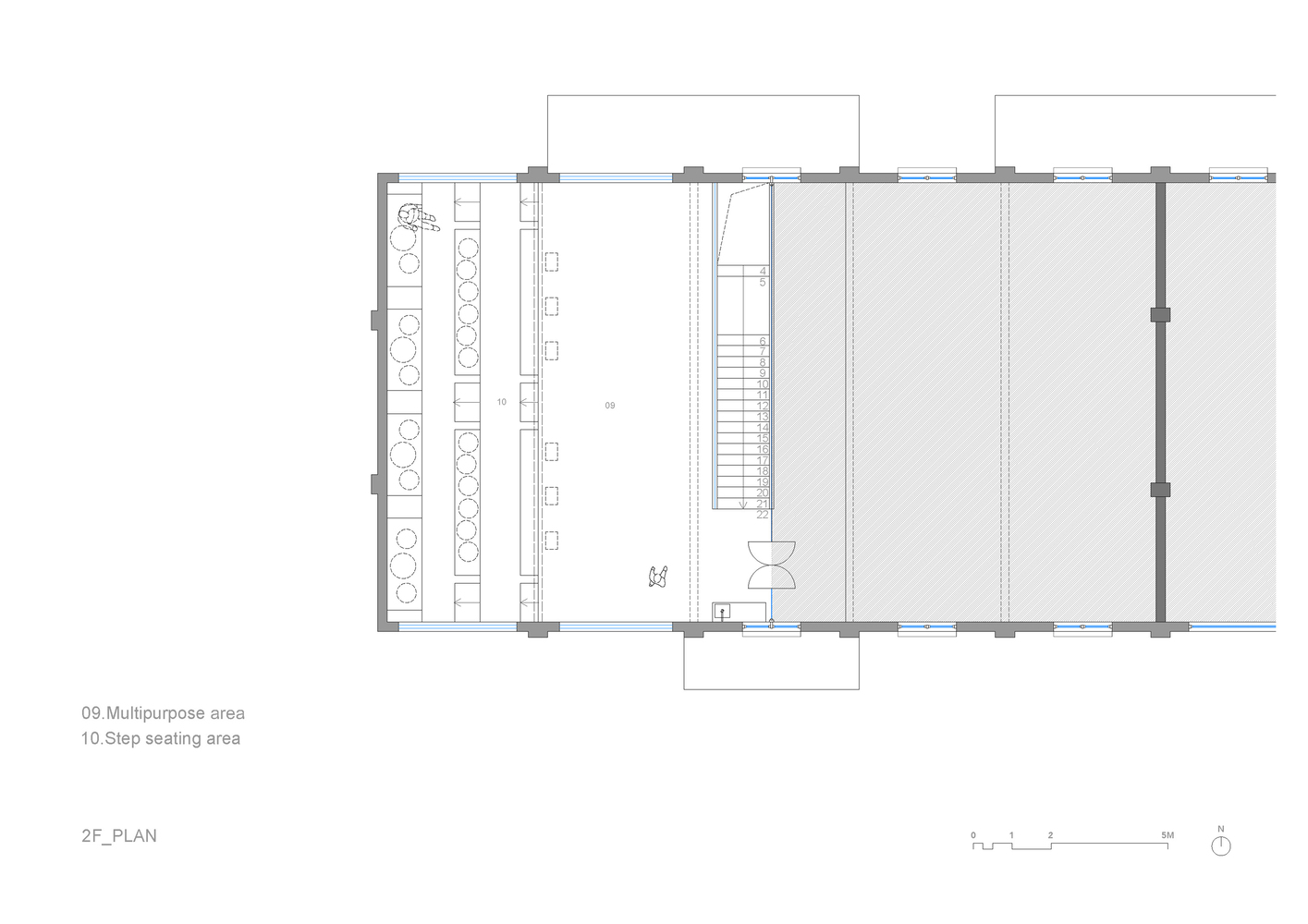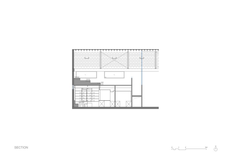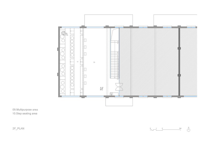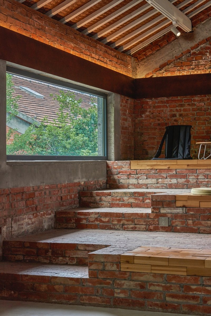 Upstairs, the design takes on a restrained character. Stepped seating made of reclaimed red bricks grounds the space, evoking the feeling of a natural terrain. Slender timber strips mark subtle boundaries, balancing intimacy with openness.