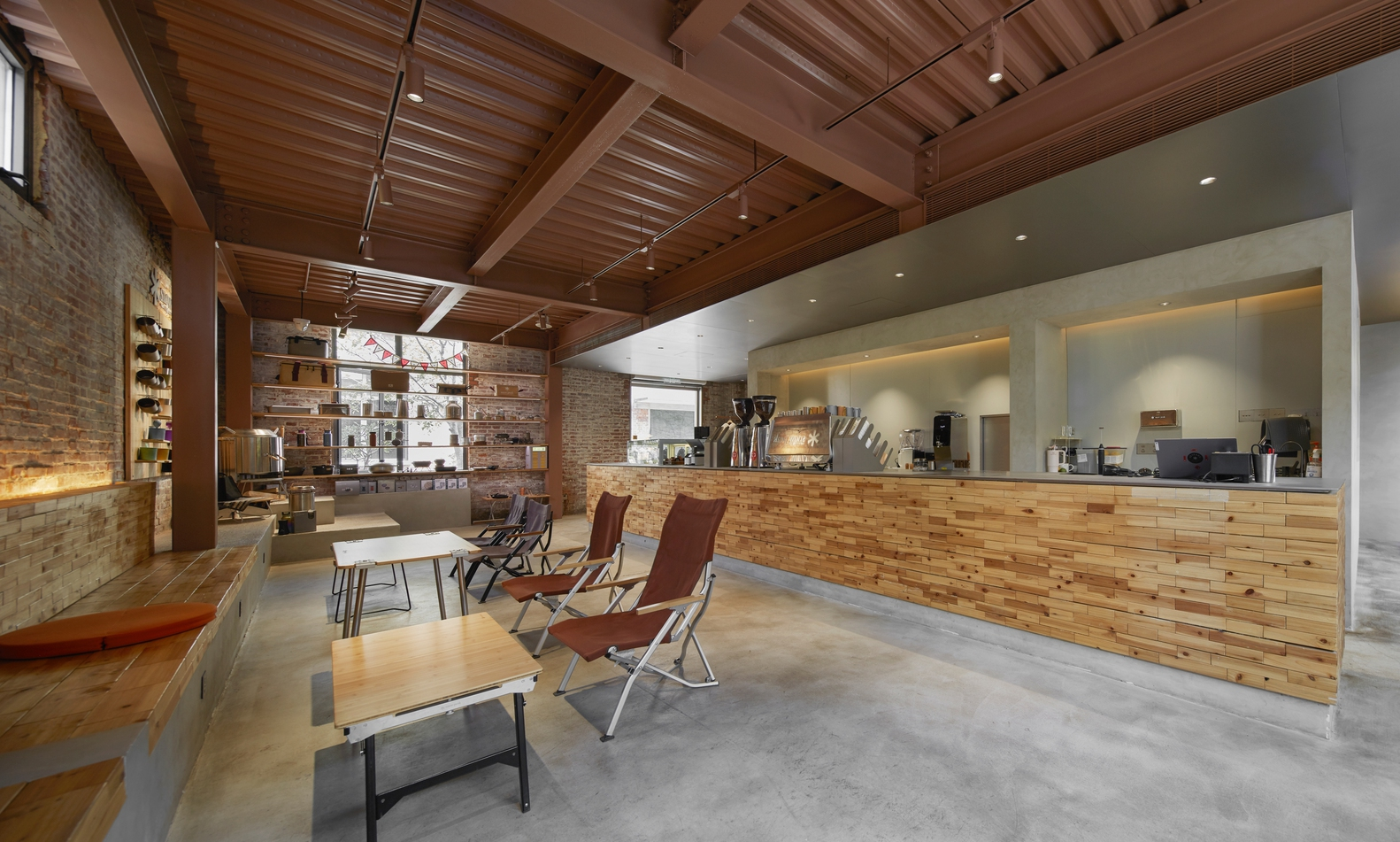 Upon entry, the multifunctional bar becomes the spatial anchor. Constructed from layered timber strips reminiscent of stacked red bricks, it integrates coffee preparation, brand display, and cashier functions.