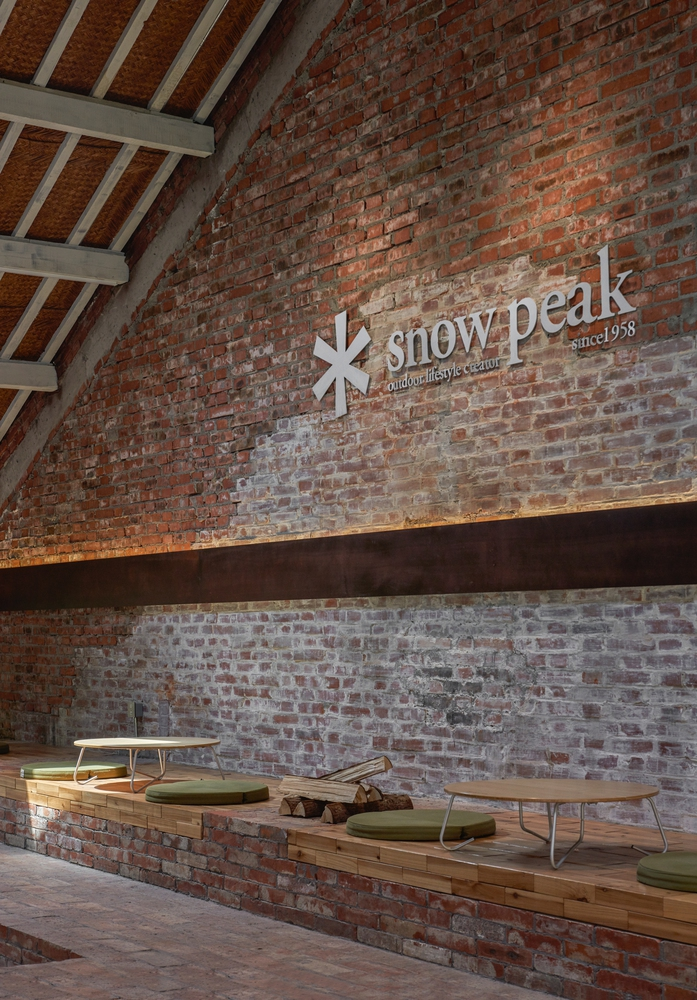 The existing beams, painted white, soften the weight of brick and wood, infusing calm while reinforcing Snow Peak’s aesthetic of nature-inspired minimalism.