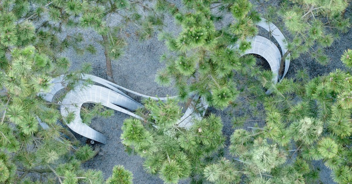 By interweaving steel bars among the pine trees, the structure emerges not just as a bench, but as a fluid spatial gesture—an elegant loop that echoes the dynamic flow of nature while providing functional utility. The curved steel outlines define both the backrest and the boundaries of the seat, seamlessly integrating structure, sculpture, and landscape.