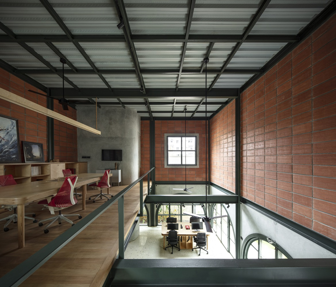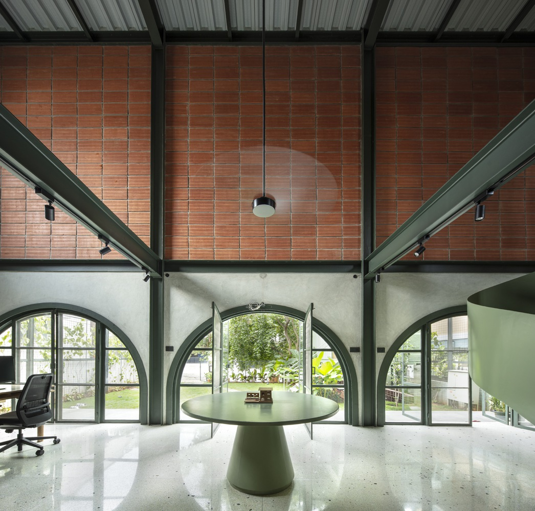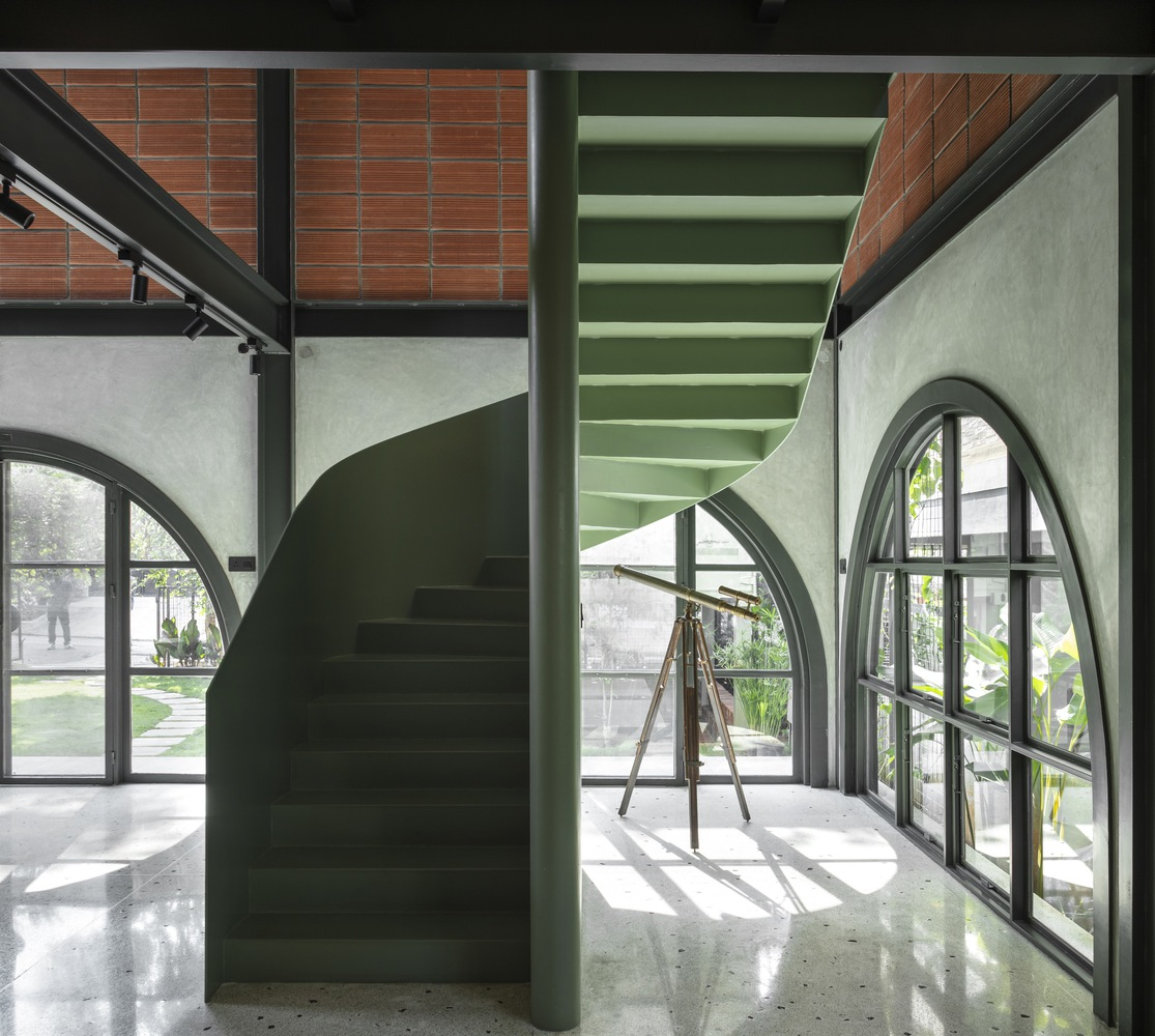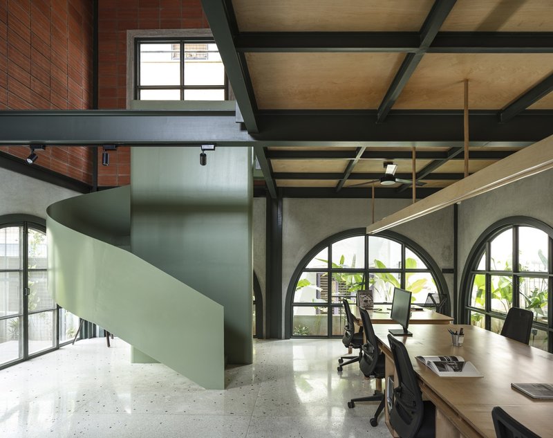 Inside, the staggered volumes allow visual connections across the double-height studio. The ground floor hosts open workstations, a material library, and collaborative areas, while the mezzanine serves as a discussion zone and private workspace for the founders. The centerpiece is a striking sage green circular metal staircase, symbolically connecting people, levels, and ideas while reflecting the colors of the surrounding landscape.
