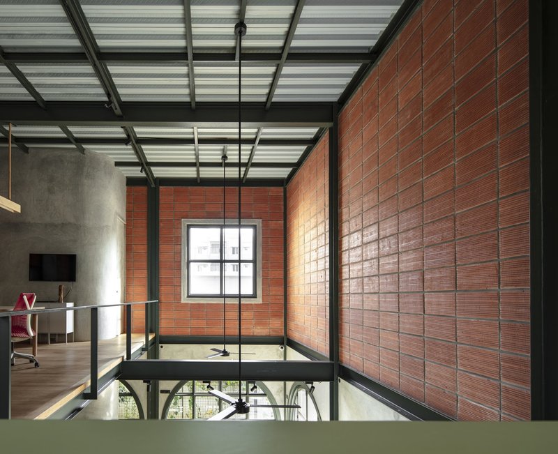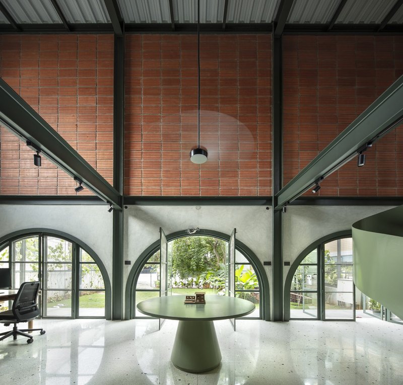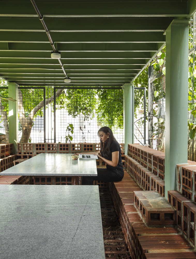 Anchored by a bold exposed framework, the design blurs the line between built and unbuilt spaces. The façade combines terracotta blocks and cement arched panels, reinforced with metal sections that provide structure and ventilation while adding visual rhythm. This thoughtful juxtaposition enhances porosity, enabling cross-ventilation and thermal comfort—a key feature in Bengaluru’s tropical climate.