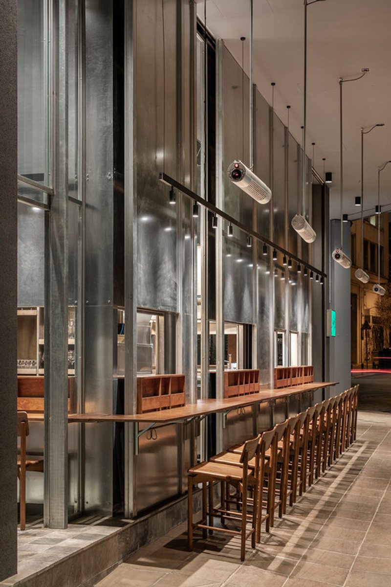 This approach dissolves the boundary between interior and exterior, making the restaurant part of everyday urban life.