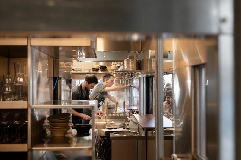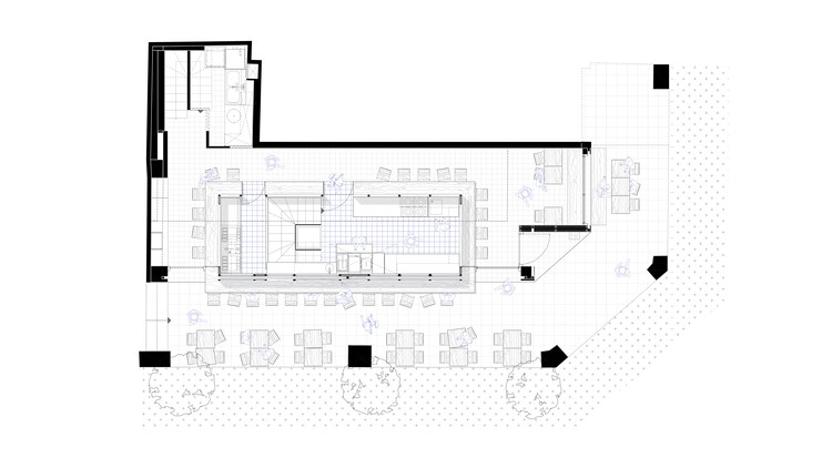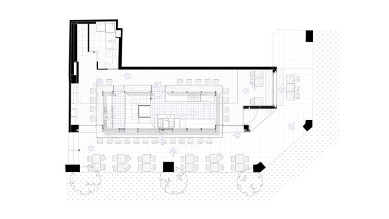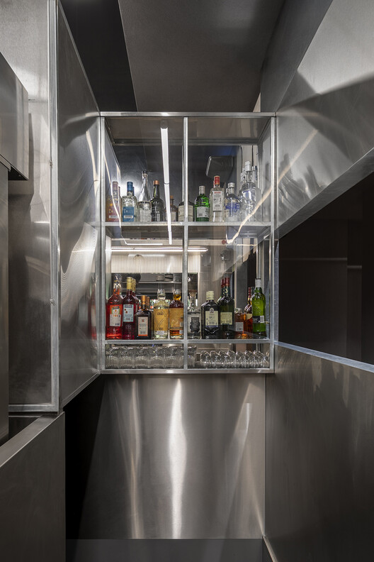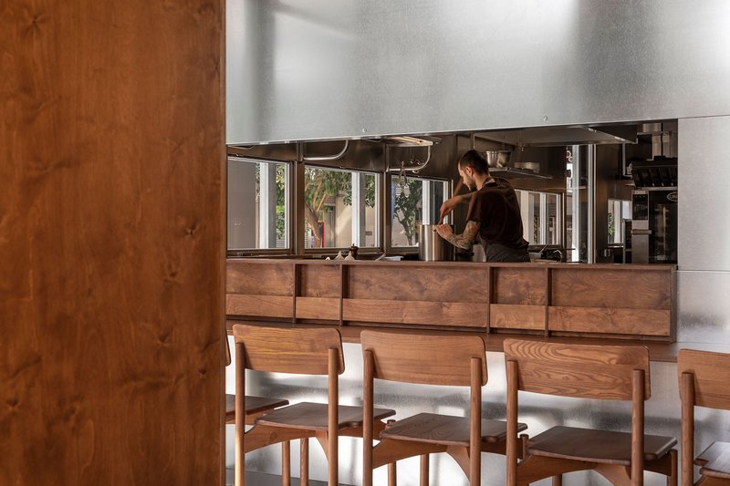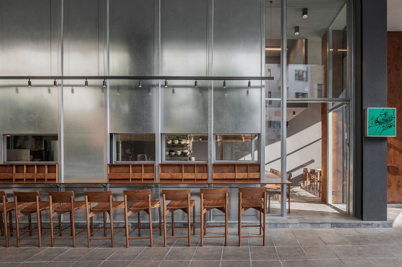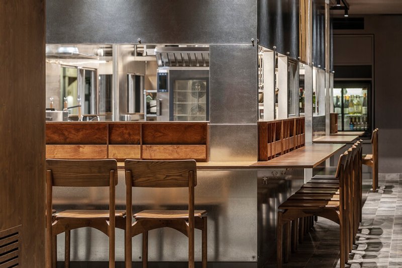 This frame operates as an “independent universe” within the restaurant, with its own rhythm and discipline. Around it, circulation, seating, and service organically unfold.