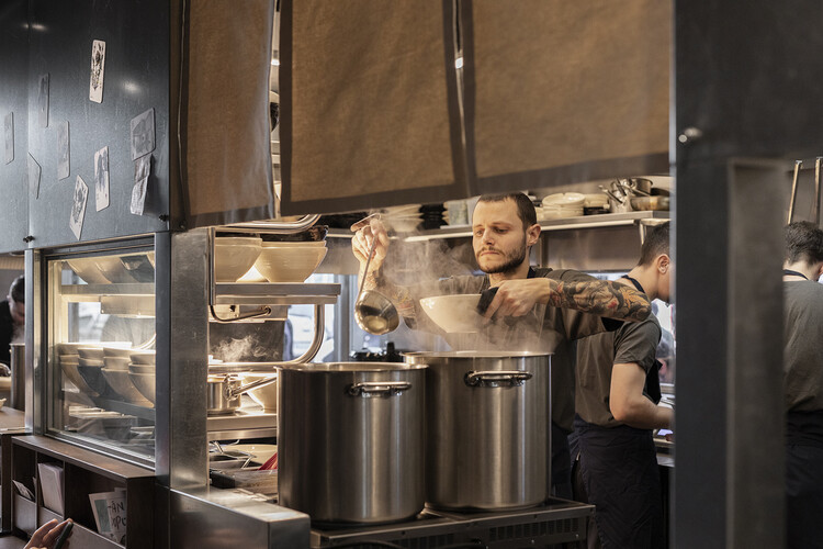 Instead of hiding food preparation, the design places it at the forefront, turning cooking into a live performance. Visitors are invited to witness every step—from boiling broth to plating noodles.