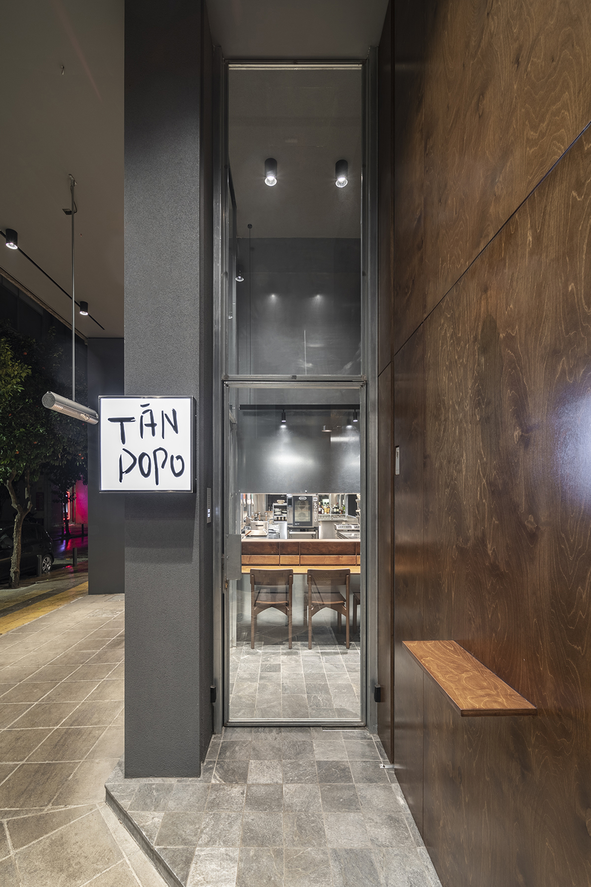 Situated behind Klafthmonos Square, the restaurant directly engages with pedestrian movement. Rather than isolating itself from the street, Tanpopo adopts a canteen-like typology that extends activity outward.