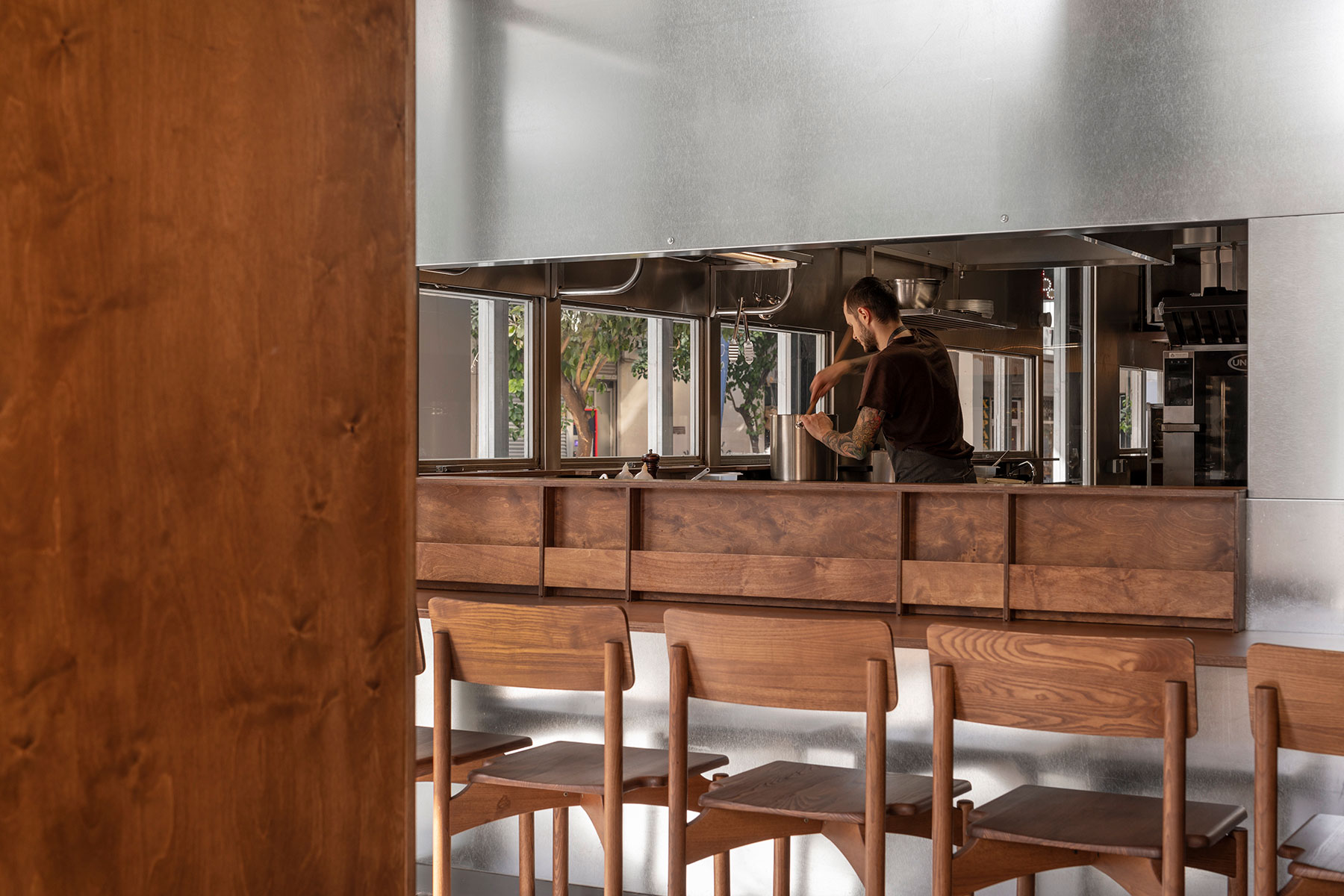 An open-kitchen ramen restaurant in Athens blending metal, wood, and street interaction to transform casual dining into architectural performance.