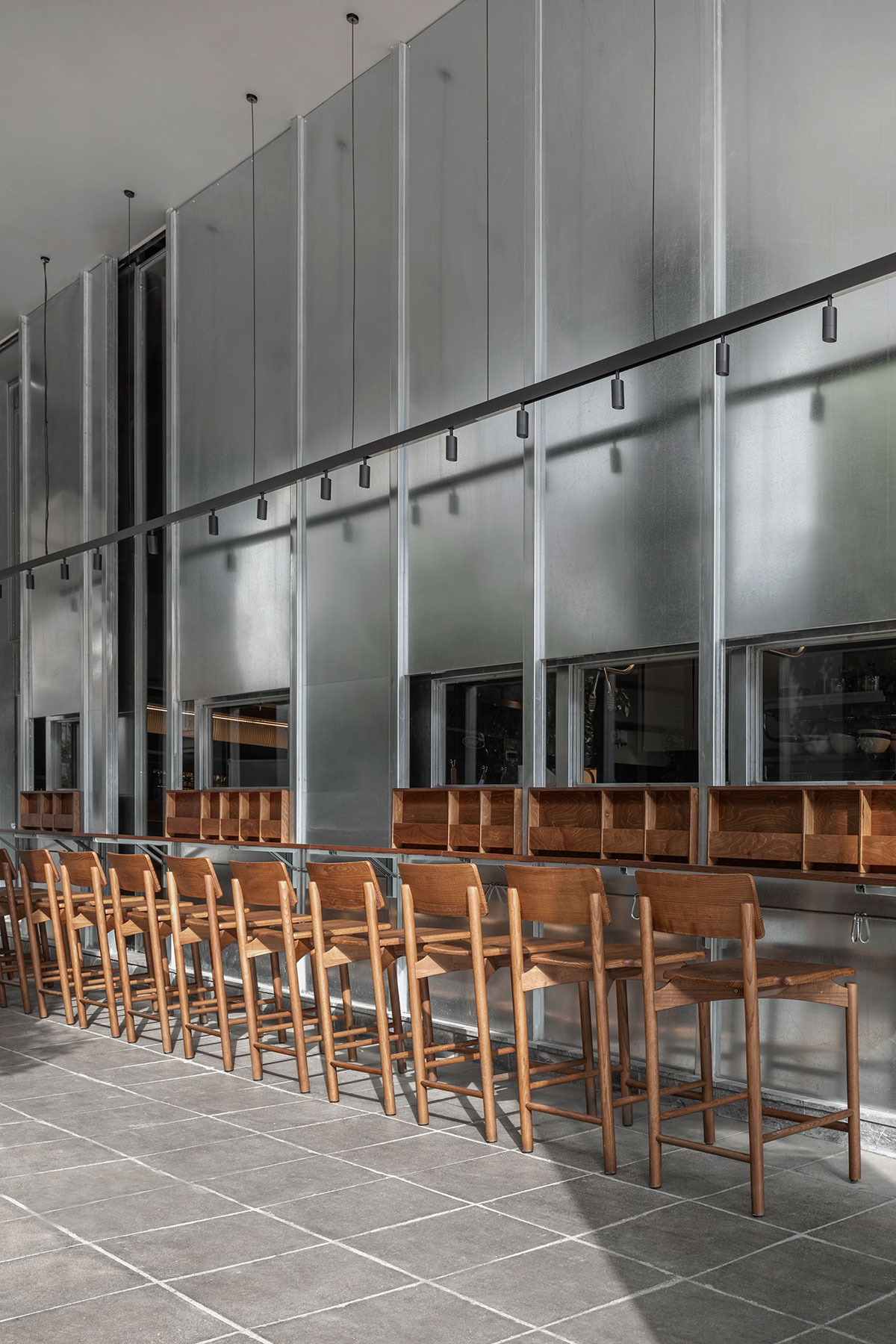 Wooden benches, inspired by traditional Japanese and European canteens, reinforce the casual character of the restaurant.