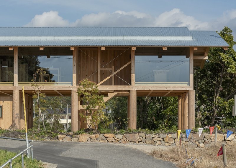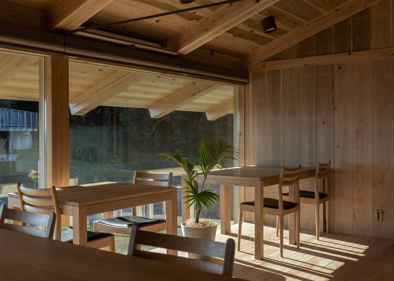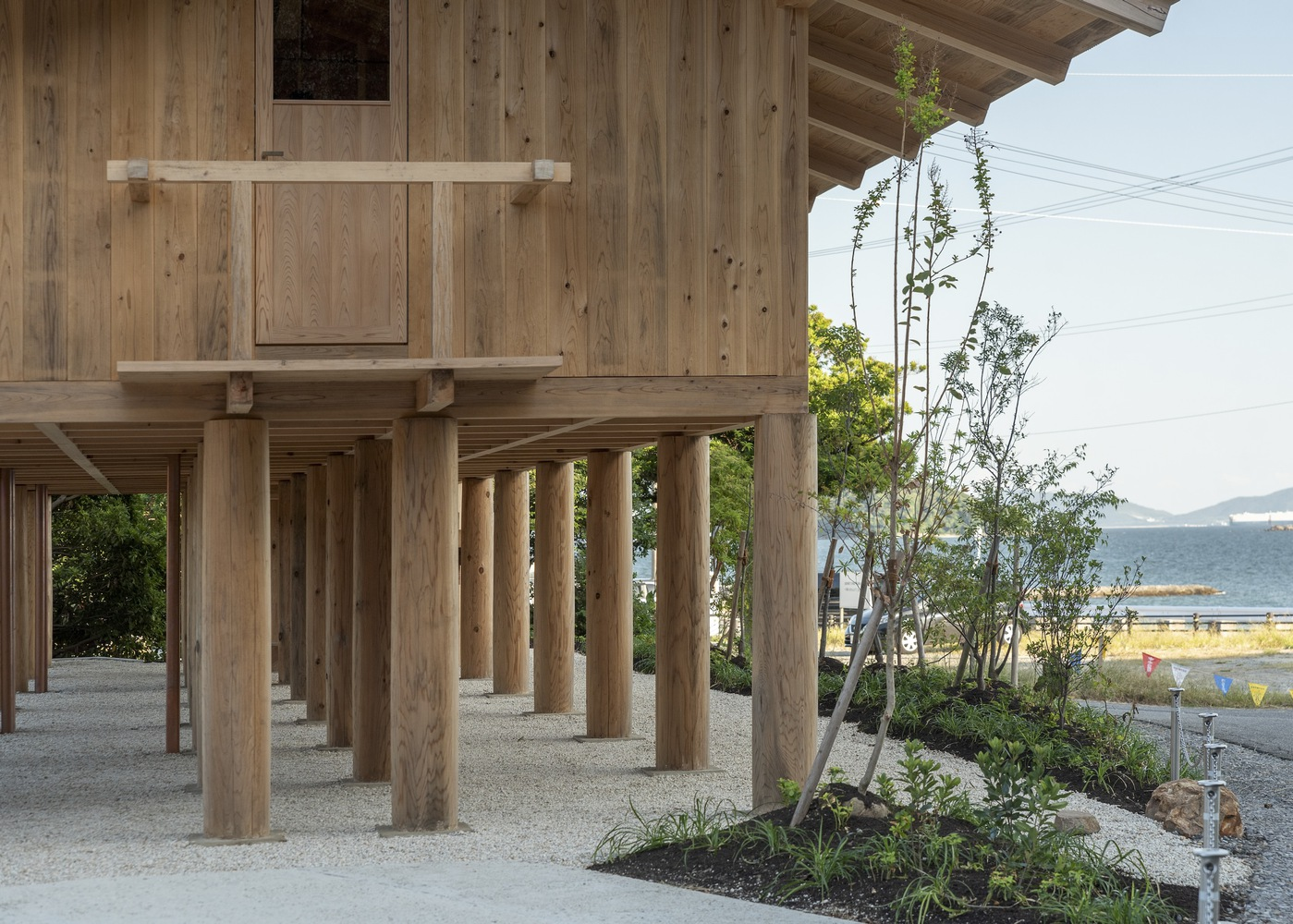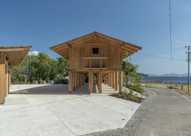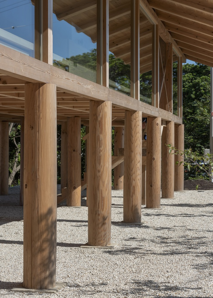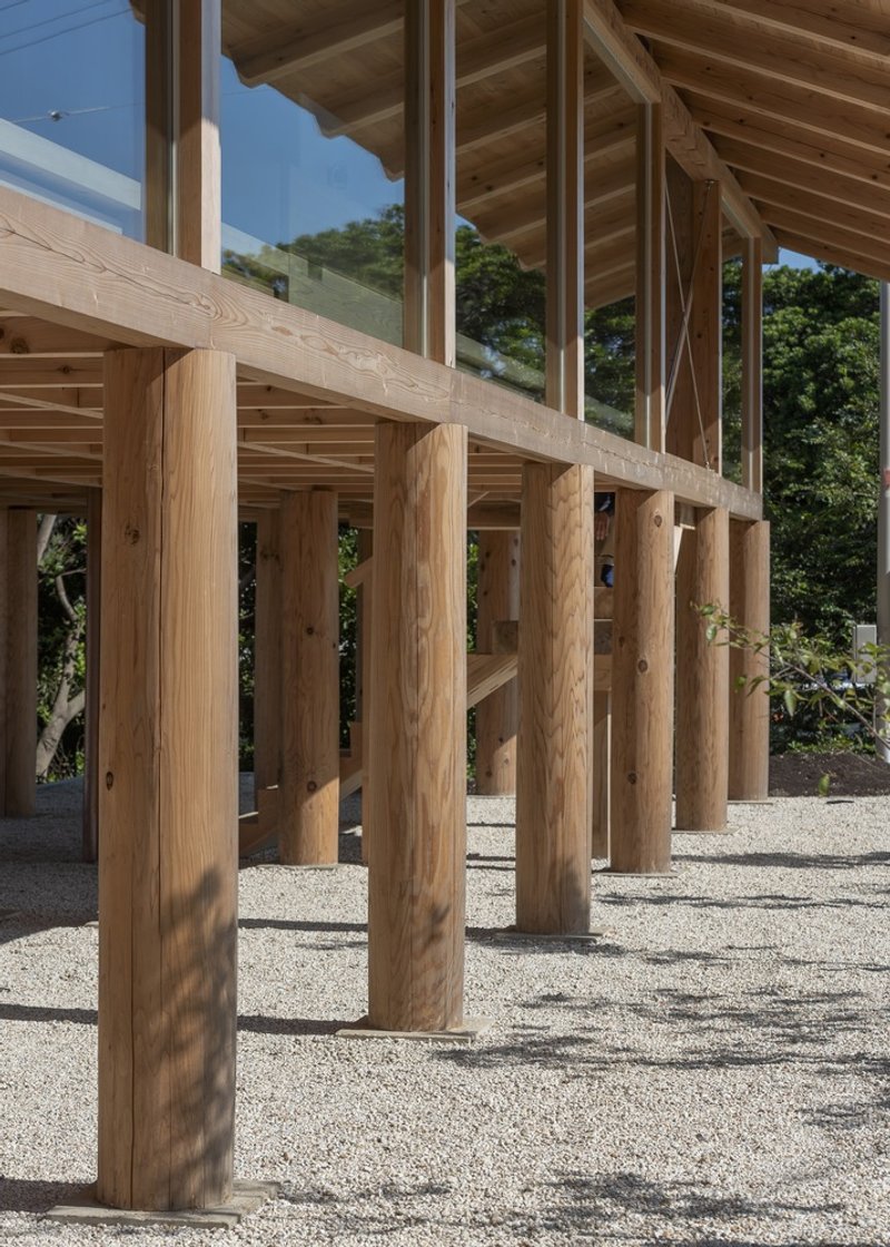 Facing a lively seaside resort that becomes crowded during summer months, the architects sought a structure that would remain serene and dignified while fully embracing the expansive coastal scenery. Wood was selected as the primary material, aligning with both the company’s natural philosophy and the surrounding landscape. The defining architectural gesture was the decision to elevate the entire building on pilotis, freeing the ground level and allowing uninterrupted views, airflow, and multifunctional use, including parking beneath the structure.