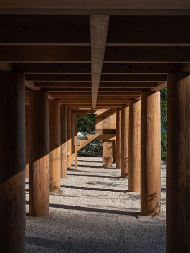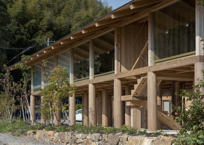 A defining feature of the project is its expressive wooden columns. Rather than machine-cutting, the architects and craftsmen shaped uneven logs into 33-centimeter circular columns directly on site, blending traditional hand tools with modern electric planers. Inspired by historic Japanese temples and shrines, the columns were subtly shaped with “mukuri”, a gentle convex curvature that lends warmth, vitality, and softness to the structure. This nuanced detail—barely perceptible at first glance—embodies the project’s deep respect for traditional Japanese architectural aesthetics.