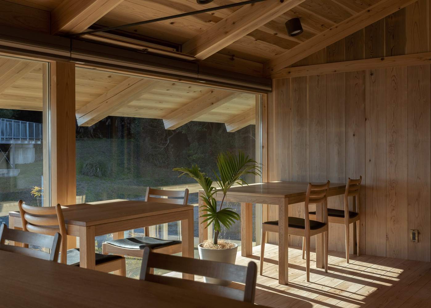 Interior spaces are defined by exposed timber beams, carefully proportioned rooms, and filtered views toward the sea. Dining, kitchen, and guest areas flow naturally, reinforcing a sense of calm continuity while allowing the building to function flexibly as both hospitality space and corporate showroom. Natural light, wood textures, and structural clarity create an atmosphere that is simultaneously contemporary and deeply rooted in tradition.