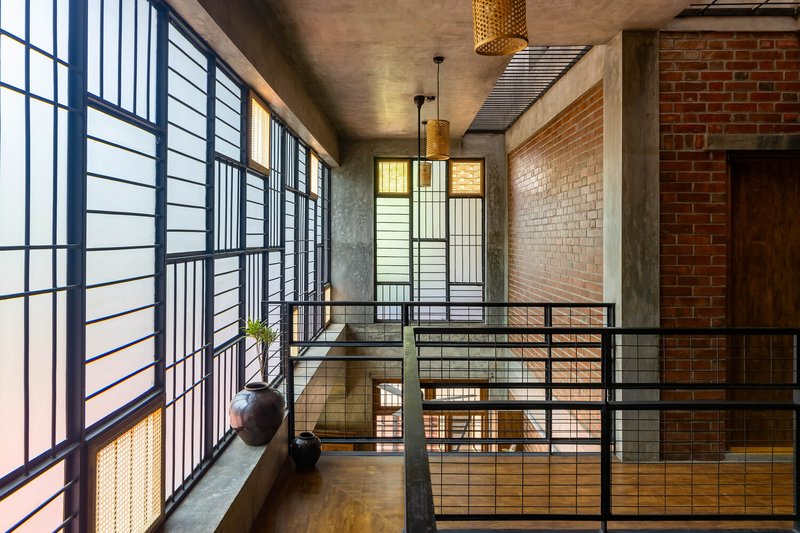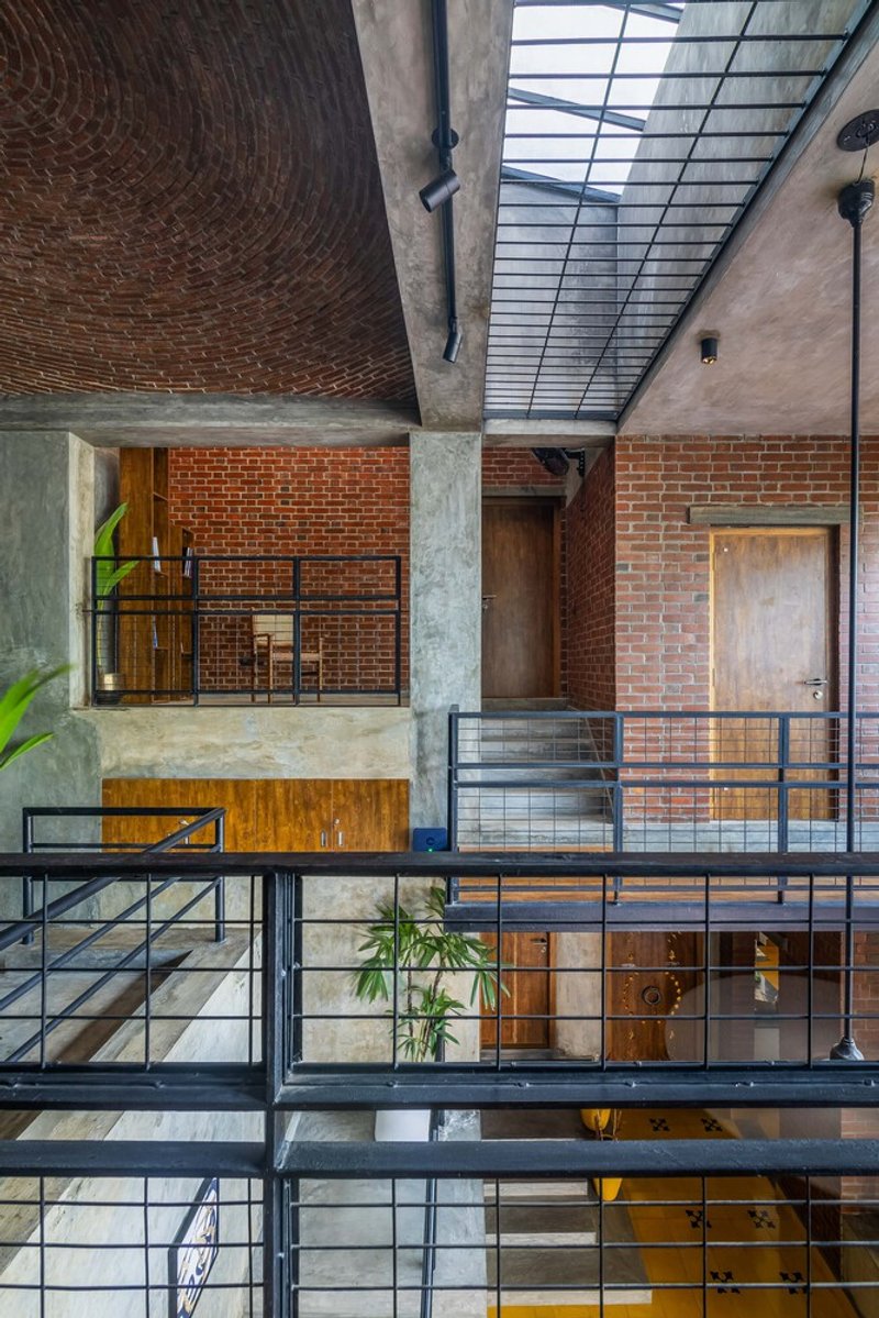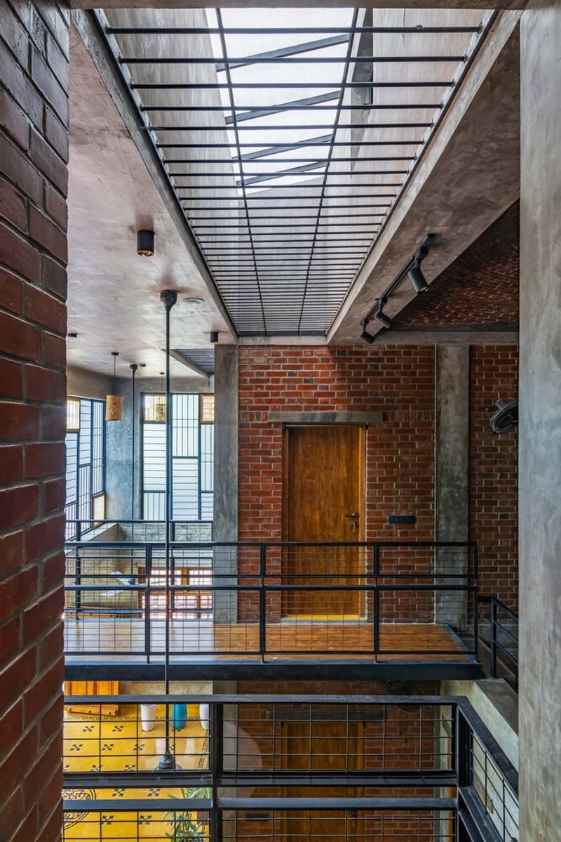The staircase, a central feature of the home, is constructed with stone and wood, creating a visual and tactile contrast to the more robust brick and concrete elements. The bridge that leads to the first floor, with its skeletal steel frame and minimal handrail, is another example of how functionality and beauty can be combined in modern brick architecture.