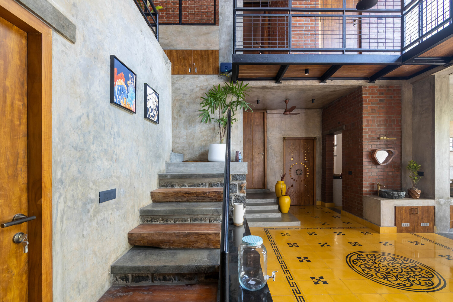 The design of the Brick Veedu House is rooted in the idea of open, connected spaces that invite interaction while embracing the beauty of natural materials. The architects at Onebulb Architecture sought to break away from the conventional use of plastered walls and heavy metal grills, opting instead for raw finishes and open volumes. This design philosophy allows the house to breathe while maintaining privacy and functionality.