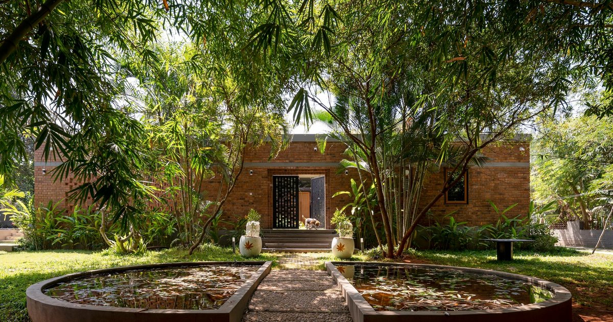 The Brick Abode blends Indo-French courtyard design, red earth bricks, and climate-responsive architecture into a serene weekend retreat near Auroville.