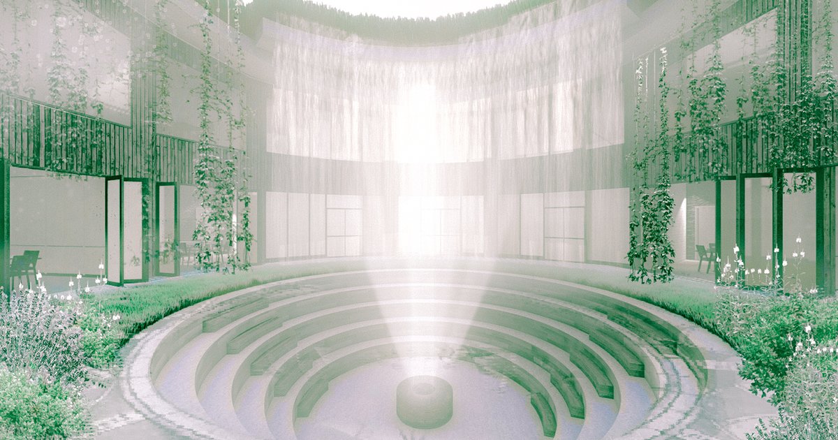 The form of the building is a sort of nod to history, because it was inspired by antique temples and medieval monasteries, which can be seen in the central circle-based layout and amphitheater that acts as a metaphorical beginning - with its beam of light and cascading water