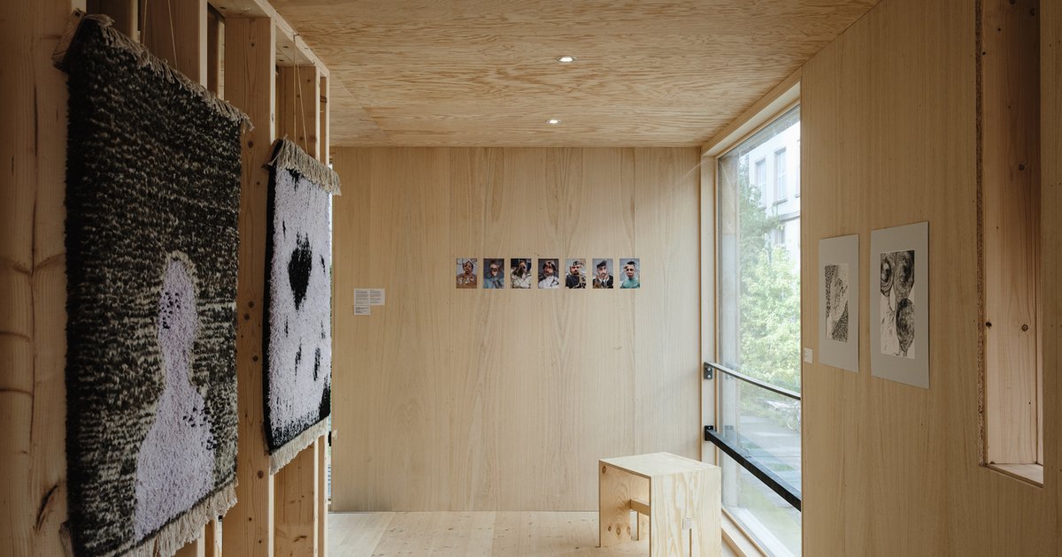 Inside one of the modules, the walls and ceiling are lined in plywood. A textile artwork hangs on one wall. Photographs are pinned along the corridor. A plywood stool sits in the corner. The space is small, warm, and finished entirely in timber. This is the quality of the residential modules: compact, prefabricated, and lined in natural material. The narrow window frames a view back to the courtyard. The module could be a student room, a gallery, or a workshop. That flexibility is the point of a prototype.