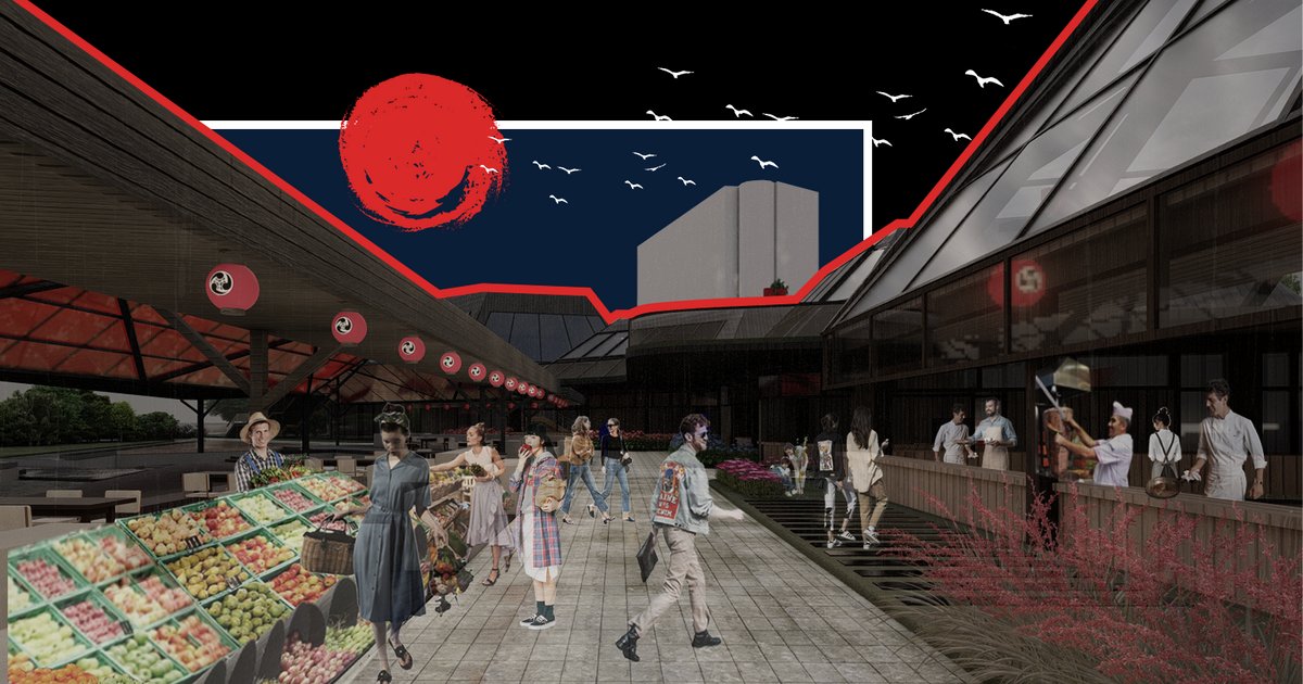 The project is located on a seaside land in Tokyo, Japan. Therefore, the main settlement decision of the project was based on the relationship with the sea. In this context, the facades of the buildings in the project face the sea. Based on this orientation, a forum area facing the sea was designed and enriched by placing sales units and food kiosks around this forum area. Japanese street culture has been characterized by traditional food stalls called 'yatai' since the 1600s. An average of 10 people chat with each other while they eat in yatai, which gained popularity after World War II. The street designed in the project is designed in a way that allows socializing in this way.The street food culture, which is very common in Japan, was supported by the design of the project, and food streets for food shopping were designed on both sides of the forum area. Since the project is a food culture forum, four different chimney-like structures were created in order to reflect the project kitchen function on the form. At the same time, these chimneys can be considered as modernizations of the iconic steep roofs of Japanese local architecture. On the basis of the project, besides being evaluated as an intercultural bridge, it also has the characteristics of a bridge that connects the two sides of the land on which it is located.
