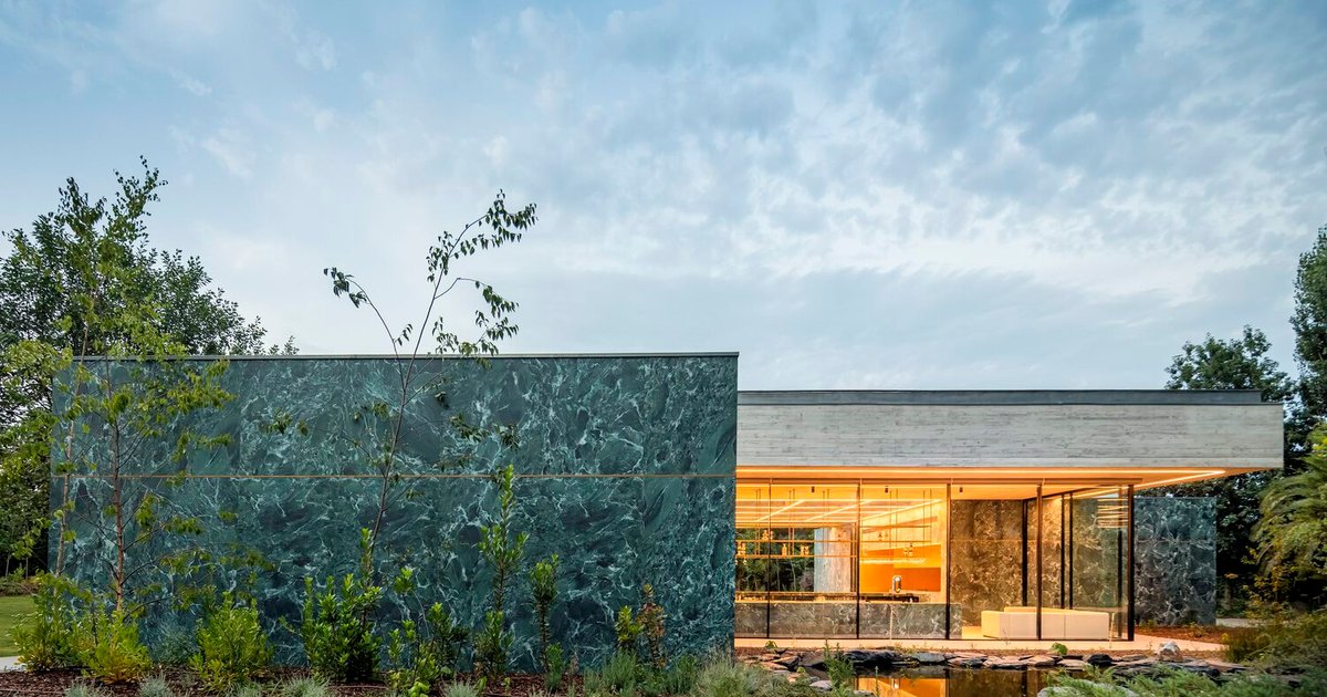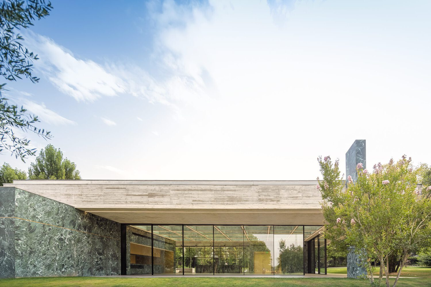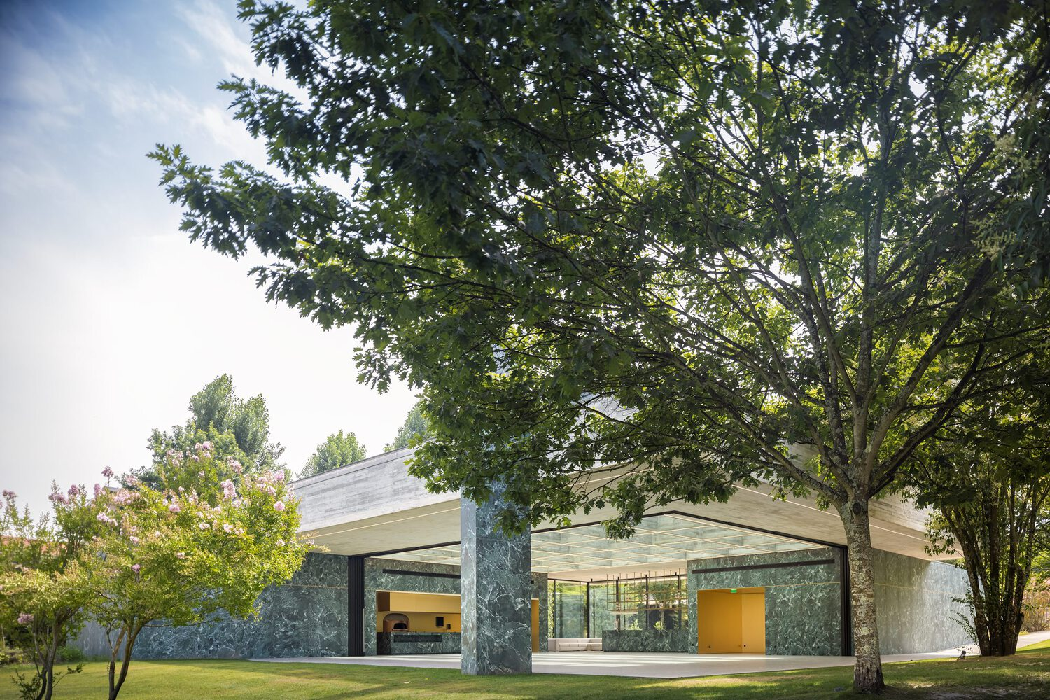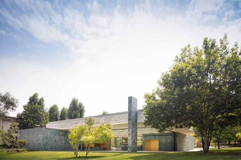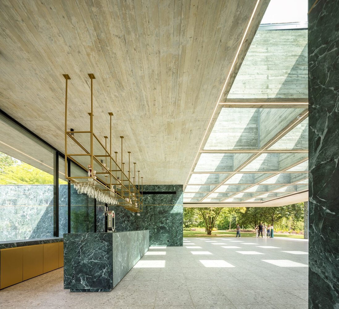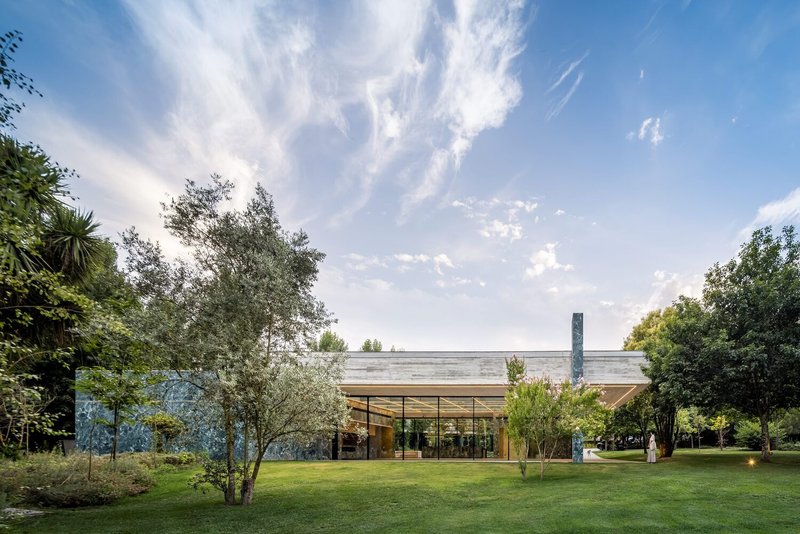 The pavilion is characterized by its pure volumetric forms that evoke a sense of modernist minimalism. The relationship between the built environment and the garden is integral to the design, fostering a seamless integration of indoor and outdoor spaces. This symbiotic relationship is achieved through large glass windows that allow natural light to flood the interior while providing unobstructed views of the surrounding landscape.