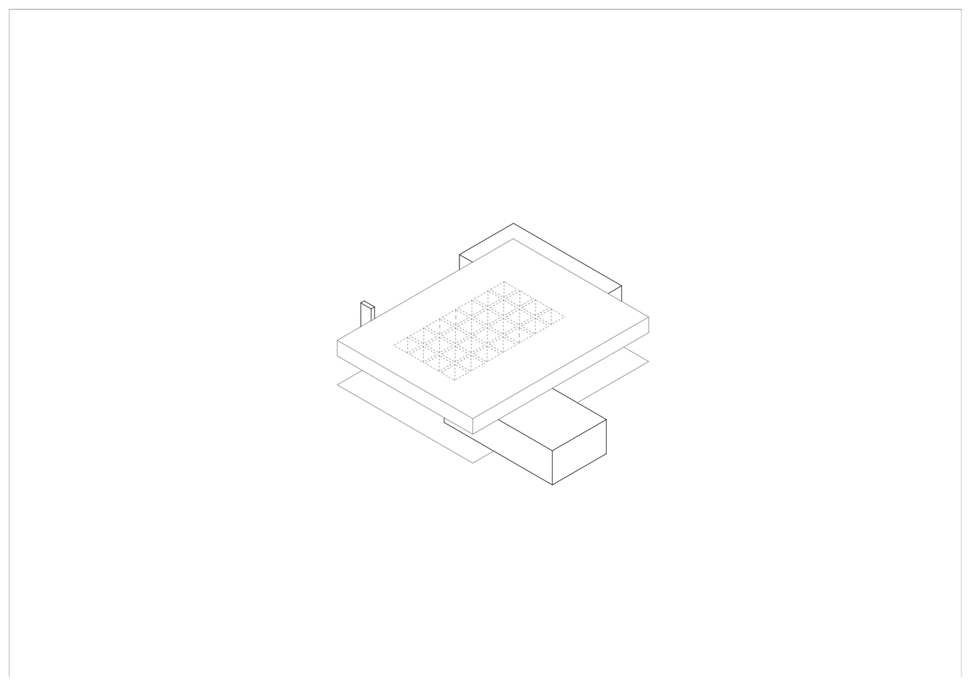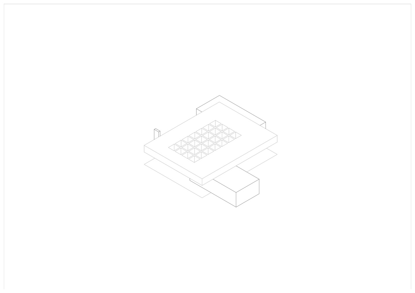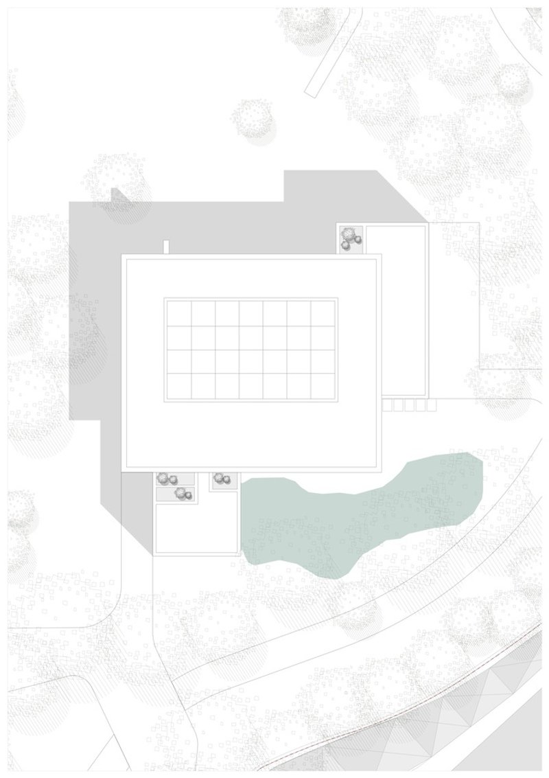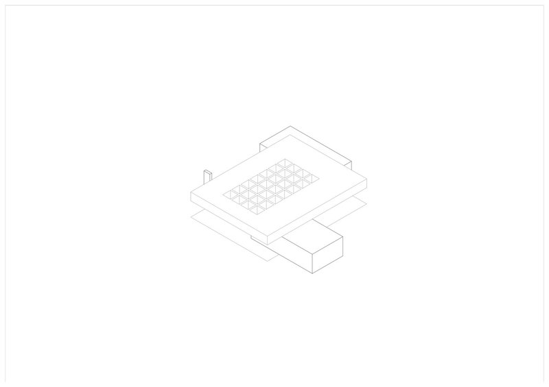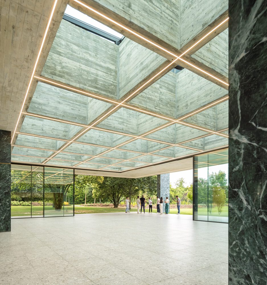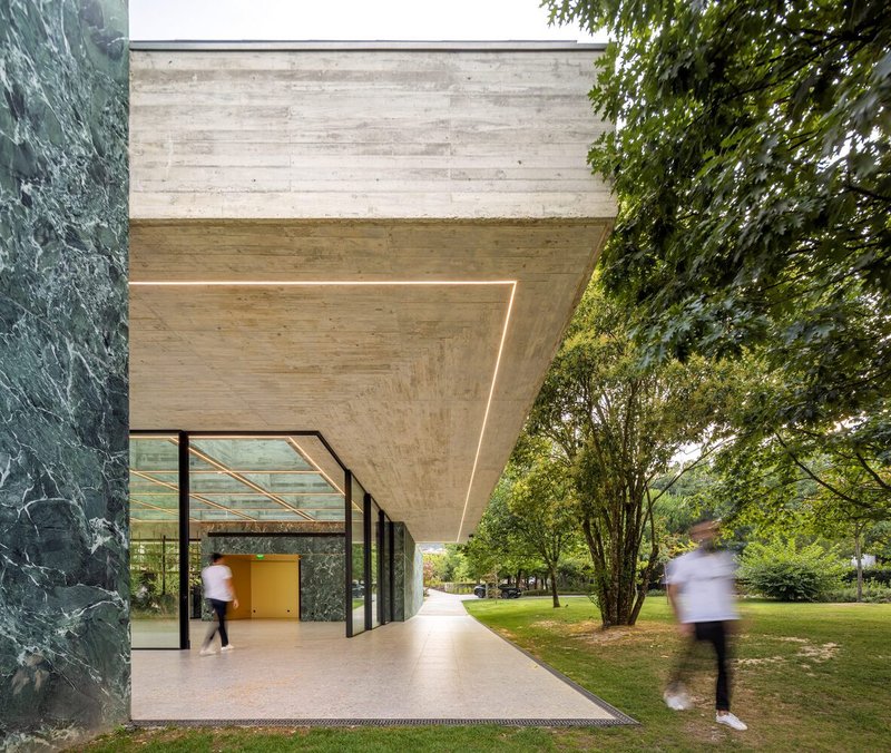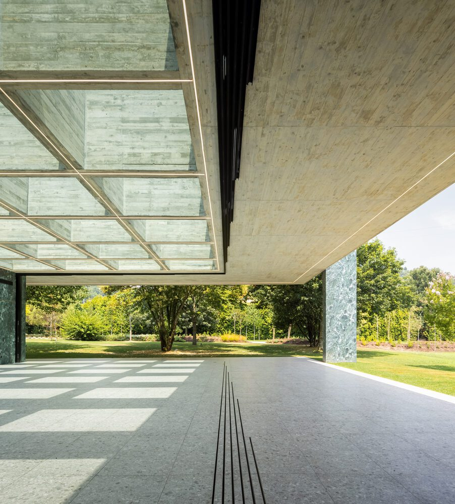 The pavilion's structural design is a testament to innovative engineering and architectural creativity. The seemingly heavy concrete roof, designed as a grid with glass openings, appears to float effortlessly above the base volumes. This design defies traditional perceptions of weight and gravity, as the roof is supported by a tangential vertical element that functions as both a pillar and a compositional anchor.