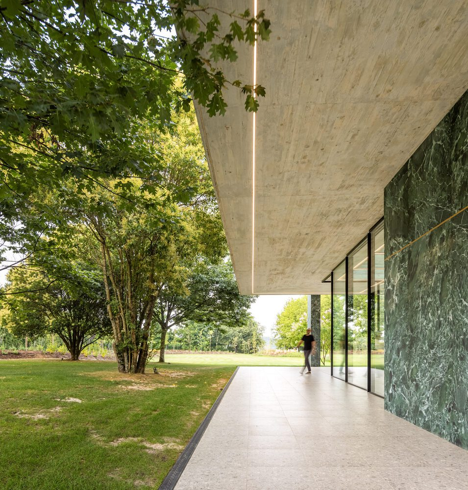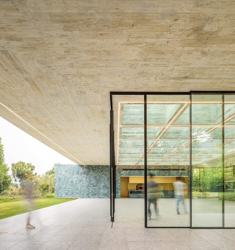 One of the most striking features of the Garden Pavilion is its integration with the natural environment. The extensive use of glass creates a transparent barrier that blurs the lines between interior and exterior spaces. This design choice allows the pavilion to invite nature inside, enhancing the users' connection to the surrounding landscape. The interplay of light and shadow, facilitated by the glass and concrete roof, creates a dynamic atmosphere that changes with the time of day and seasons.