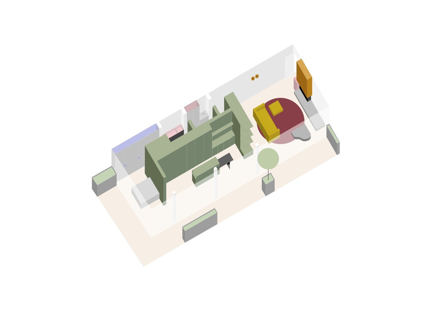 - Central Millwork Box: A multifunctional core that defines spaces without rigid partitions.