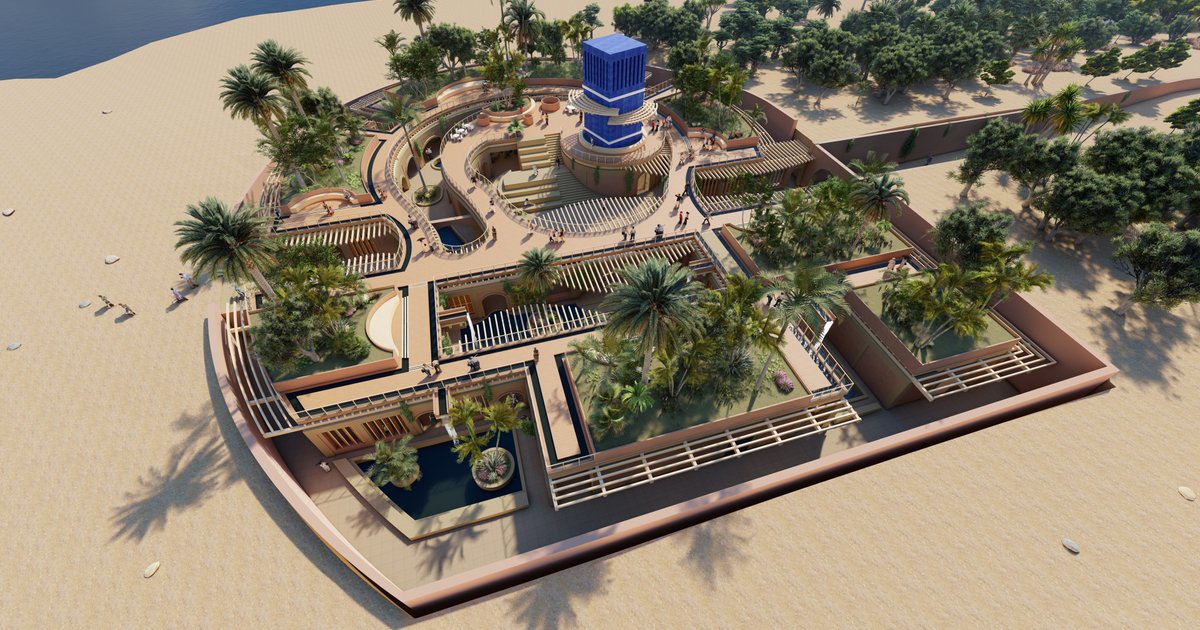 A first level below the ground forms the cultural center. At the second level passageways become a set a walkways allowing people to walk through different garden areas. Every roof has been designed to welcome typical oasis vegetation that will be cultivated: palm trees and other fruit trees. Roof terraces offer public and dense oasis landscapes in which visitors can easily ramble. They are irrigated by rivers along the project – as “seghia” (water channel designed to irrigate fields around oasis). The visitors’ perception is focused on two visible elements: the blue Majorelle wind-tower and the oasis landscape.