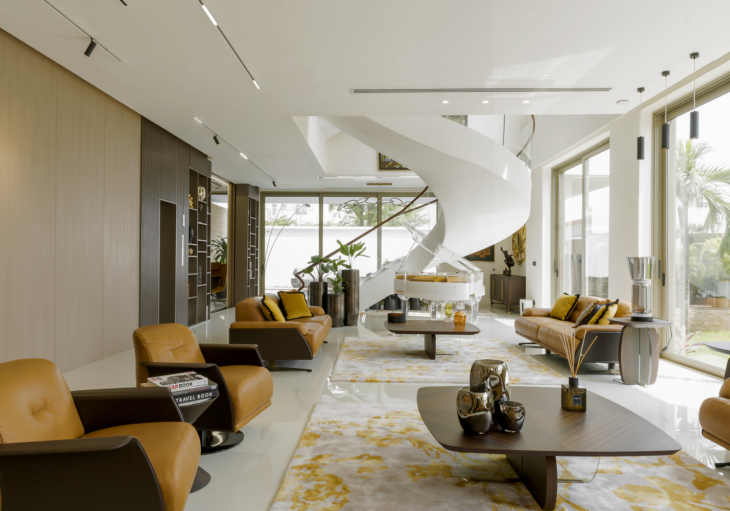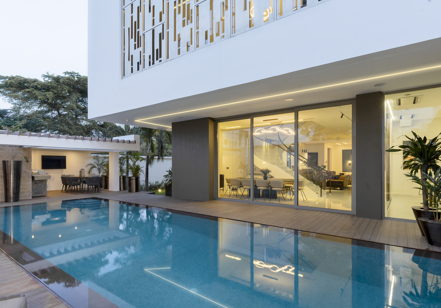 The client requested a five-bedroom, smart, sustainability-conscious residence featuring two living rooms, a study, a swimming pool, and extensive outdoor entertaining spaces. With a plot facing east, the home is oriented to maximize natural morning light, while high ceilings and tall windows amplify the feeling of spaciousness, airiness, and connectivity throughout.