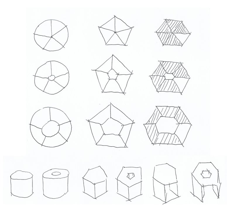 My initial idea was to design a circular construction. But after drawing it, I realized that with this dimension, the space with curvature would give a strong sense of oppression. Then I tried construction in the pentagon, but the totally identic spatial organization made the whole project monotonous and boring.