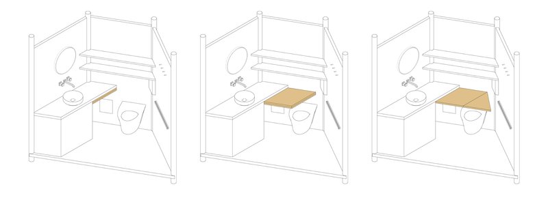 In my idea, there is no need for a special baby care room outside. We can do this in these public toilets. The foldable baby care table is normally folded away under the washbasin table. When a parent needs to change the baby’s diaper, this folding table can be opened in two parts to become a full baby care table.