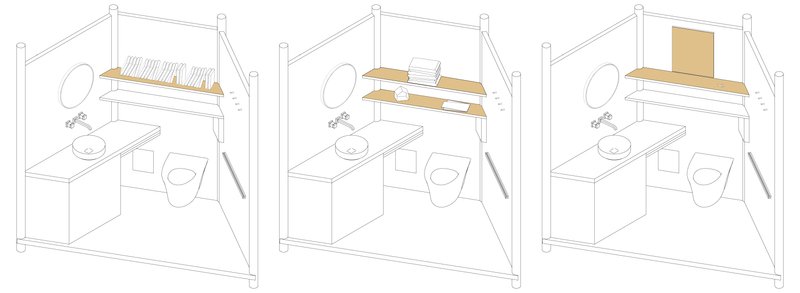 There are double shelves in the toilets for exchanging books or second-hand items such as clothes, children’s toys, etc. These books and items could be freely taken or exchanged by users rather than organizing complex disposal events. Users can pick up a book and read it to pass the time while using the toilet. Also at the top of the bookshelf, a drawing board could be placed for users to share emotions or stories. All of these ideas are aimed at making the public toilets not only a place of hygiene but also a place where different peoples could communication and exchange with each other.