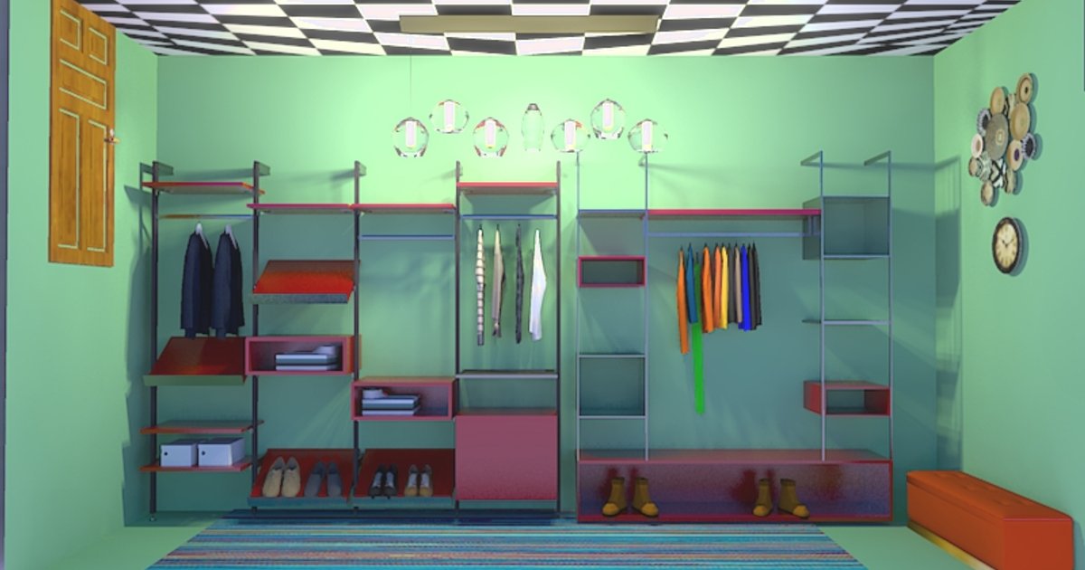 Since the floating shelves did not work I tried to mimic that style by using wireframe-like open structures as closet storage the material and the colors are chosen reflect the personality of the hatter.