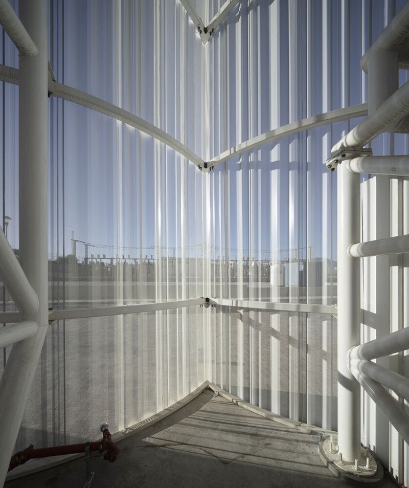 The Mayoral New Warehouse Logistics Center prioritizes energy efficiency through its innovative facade system. The building features a dual-layered facade, combining translucent polycarbonate and micro-perforated zinc. The inner layer of polycarbonate provides insulation and waterproofing, while the outer layer of zinc allows natural light to penetrate the building while shielding the polycarbonate from harsh solar radiation.