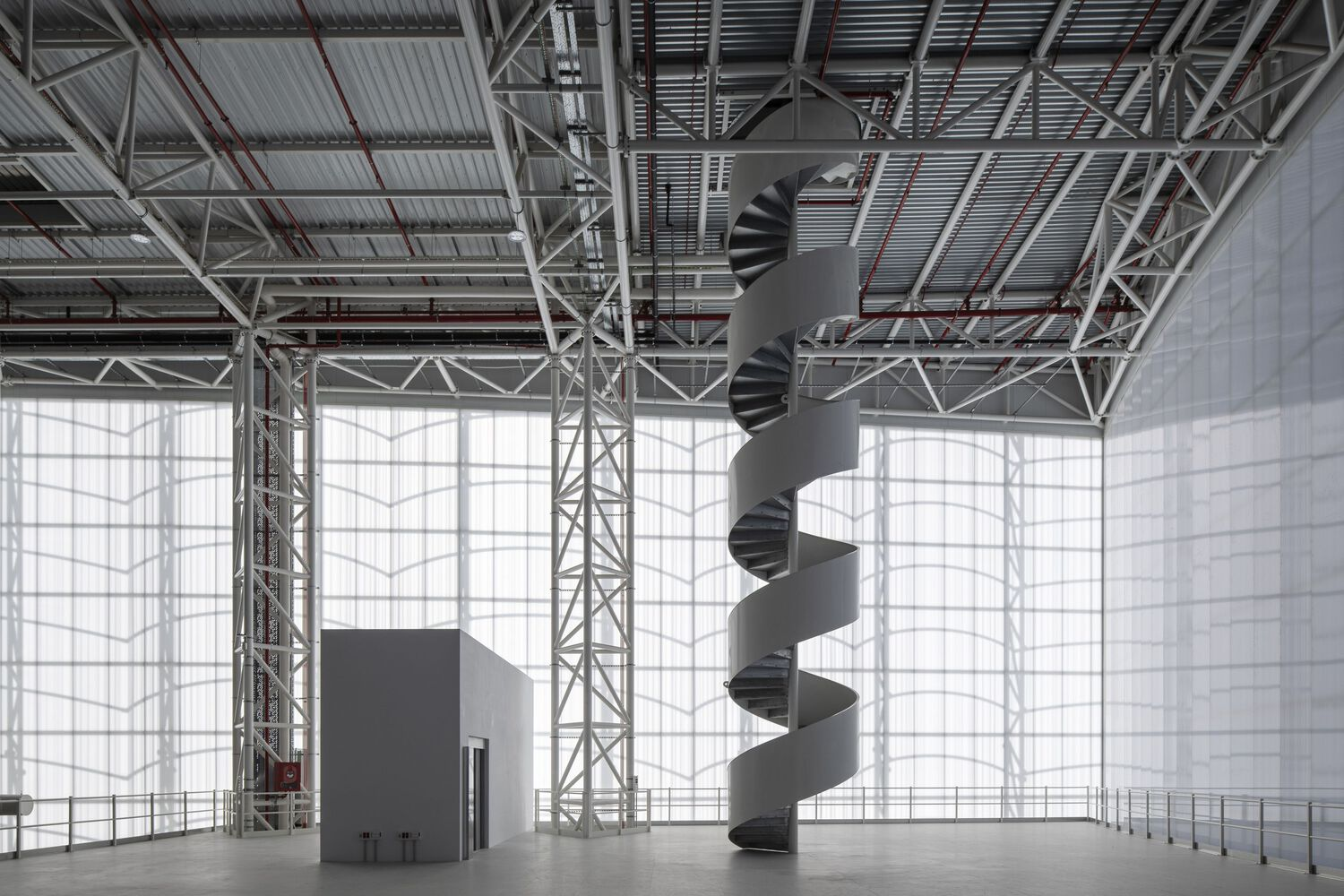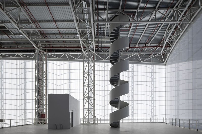 The building’s structural system is composed of triangulated tubular steel, manufactured in Lalín, Galicia, and spans up to 32 meters. These beams were carefully transported and assembled on-site to form the warehouse’s large and open internal spaces. Additionally, the folded zinc sheet facade was produced in Asturias, while the polycarbonate skin for the interior was sourced from Álava.