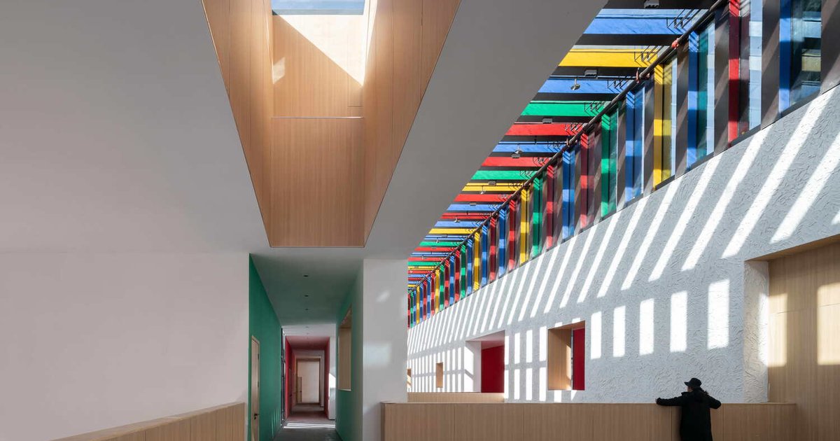 The cubic volume contains a 700-seat auditorium with skylights along its side, and its roof is designed as an accessible outdoor platform for extracurricular activities. This rooftop serves as an extension of the school’s functional space, blending indoor and outdoor experiences with playful student interaction.