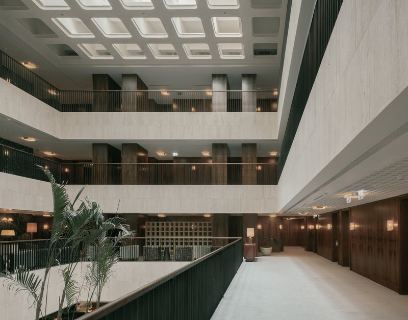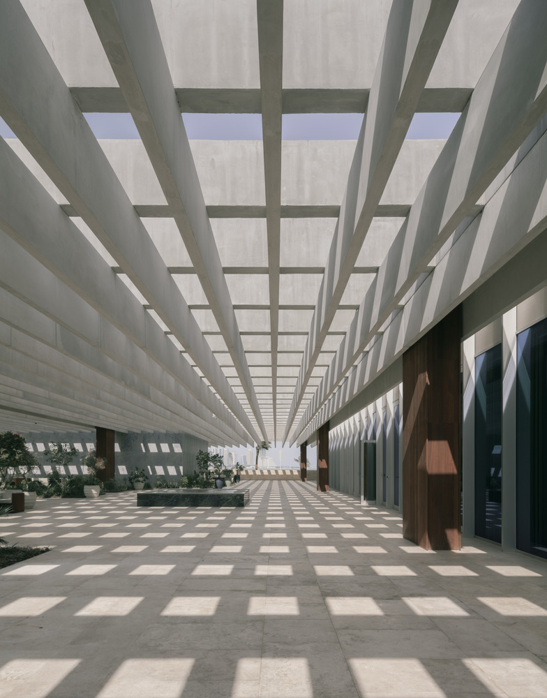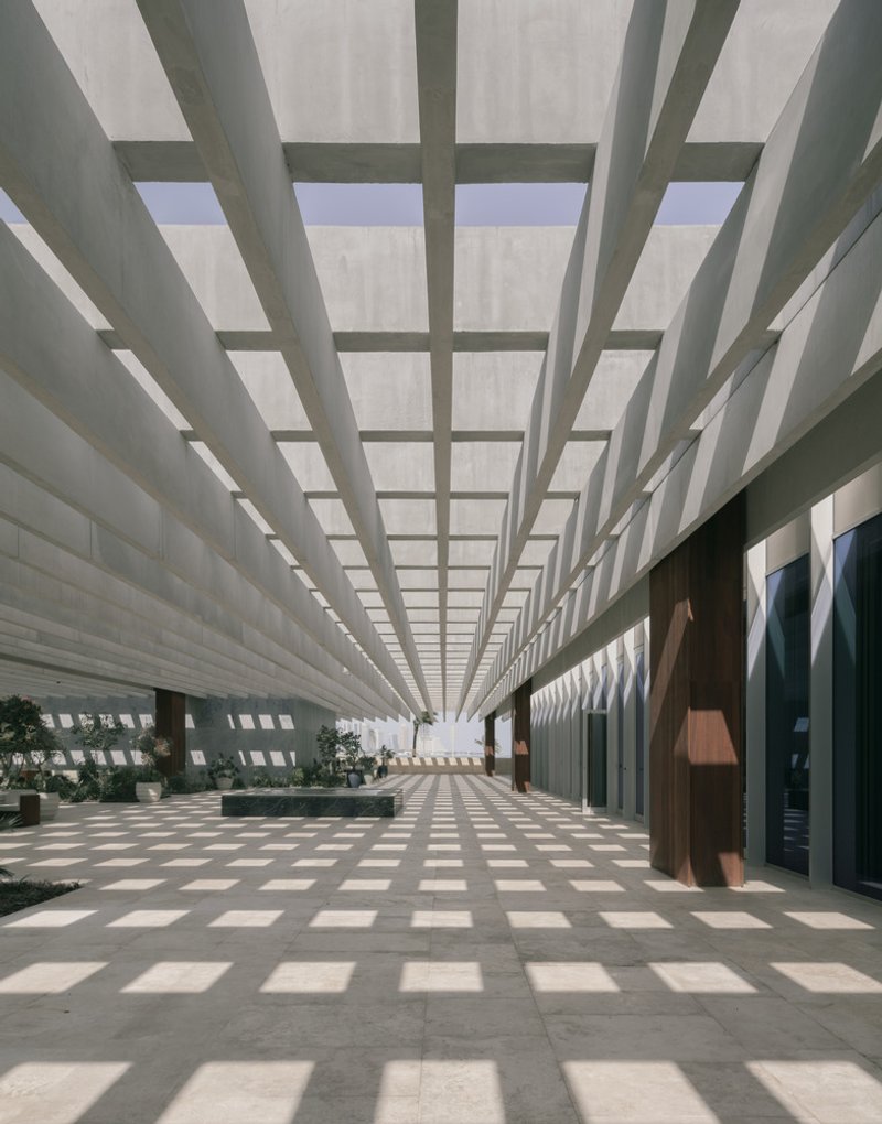At the ground level, the addition of a 260-meter-long landscaped podium redefines the building’s relationship with its surroundings. The green plinth integrates lush vegetation, tranquil basins, and curated art installations to form a serene courtyard oasis. New pavilions along the water’s edge provide hospitality and event functions, all unified by a sleek brise-soleil canopy made of slender concrete ribs. This feature not only creates shaded outdoor zones but also reflects the vertical rhythm of the original façade.