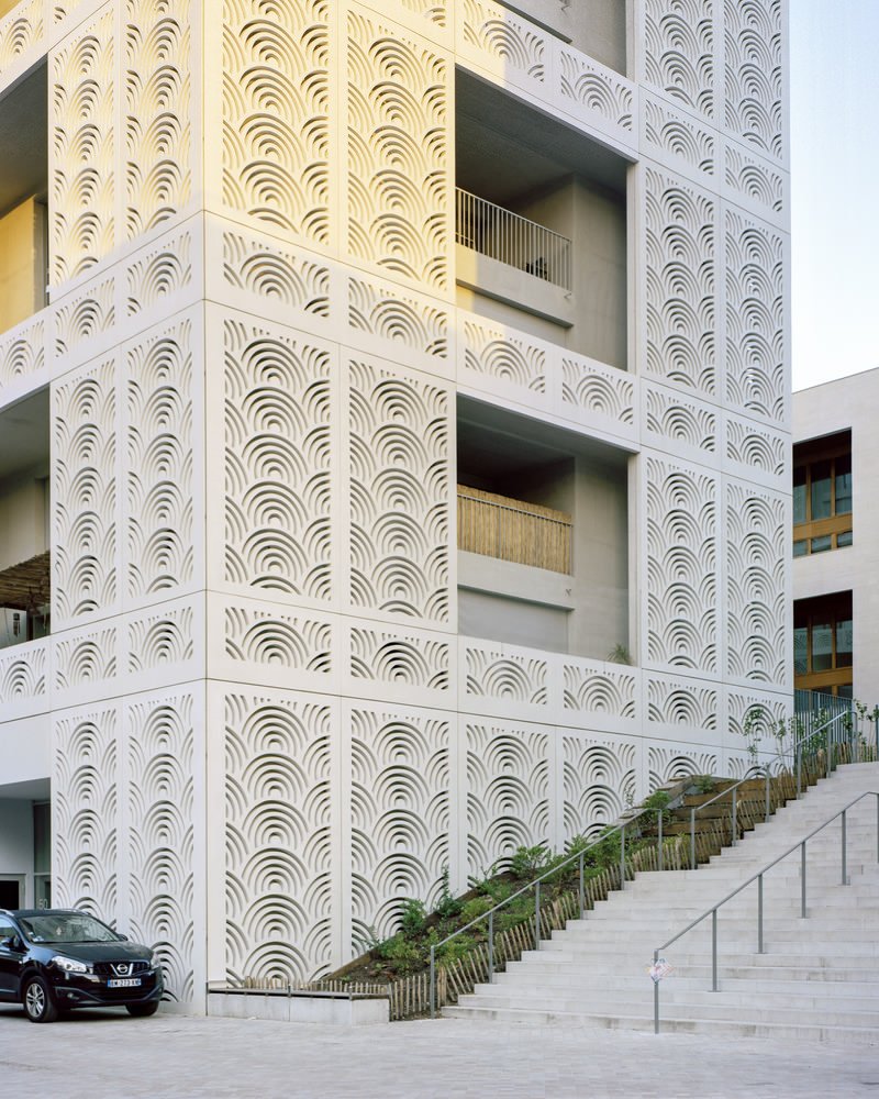 Public parking facilities (688 spaces across two levels) are integrated beneath housing blocks, minimizing street-level visual impact while providing functional infrastructure.